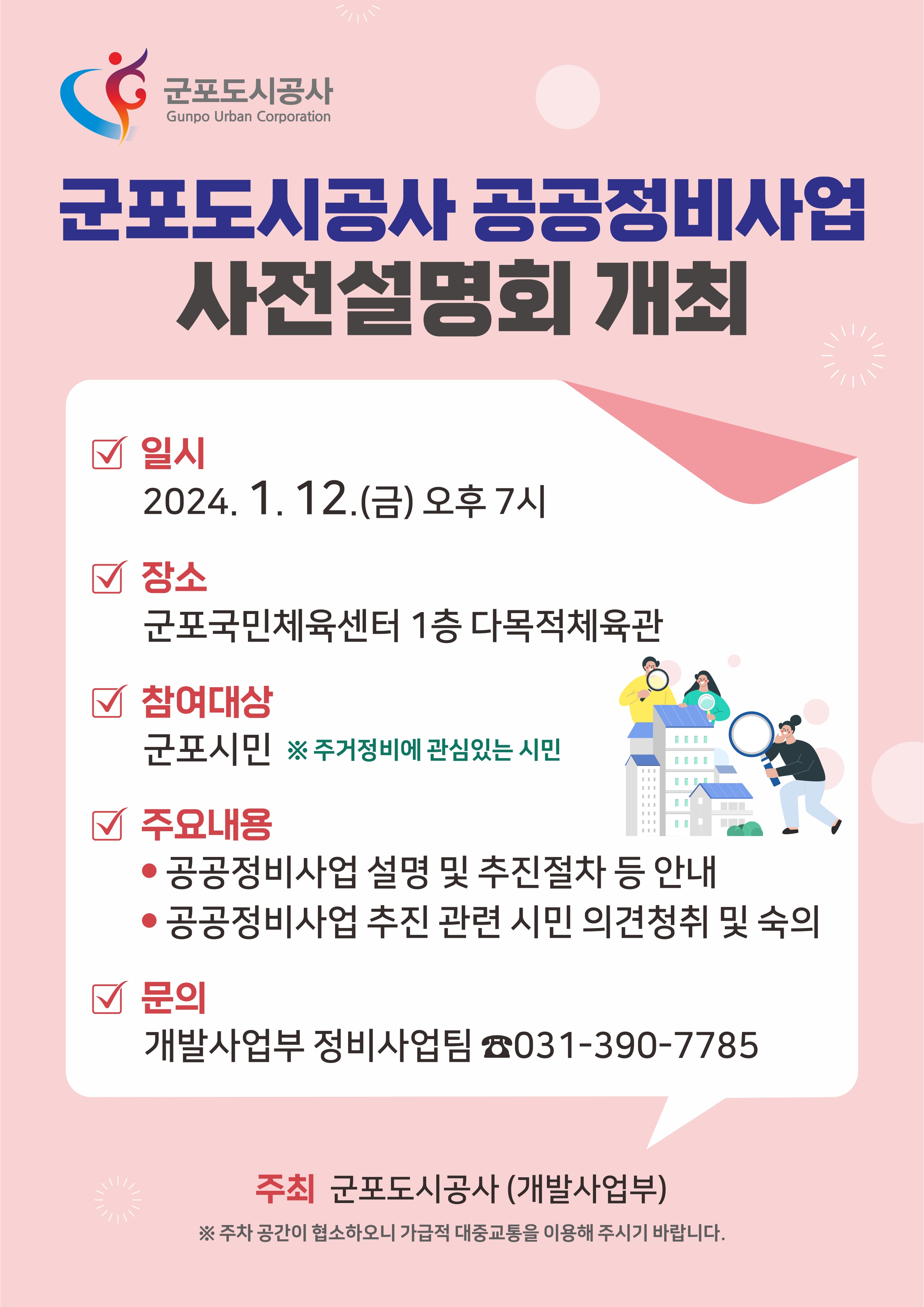 2024년 군포도시공사 공공정비사업 사전설명회 개최 주택 재개발사업 시행방식 다각화 등 시민들의 공공정비사업 추진 요구에 따라 사업 설명 및 시민 의견청취 등을 위하여 다음과 같이 공공정비사업 사전설명회 개최하오니, 주거 정비에 관심 있는 시민 여러분의 많은 참여를 부탁드립니다. ▣ 군포도시공사 공공정비사업 사전설명회 개최 안내 ○ 행사일시 : 2024. 1. 12.(금) 19:00~20:30 ○ 행사장소 : 군포국민체육센터 1층 다목적체육관 ○ 참여대상 : 군포시민(주거정비에 관심있는 시민) ○ 주요내용 : 공공정비사업 설명, 시민 의견청취 및 숙의 ○ 문의사항 : 군포도시공사 개발사업부 정비사업팀(☎031-390-7785) ※ 주차 공간이 협소하오니 가급적 대중교통을 이용해 주시기 바랍니다.
