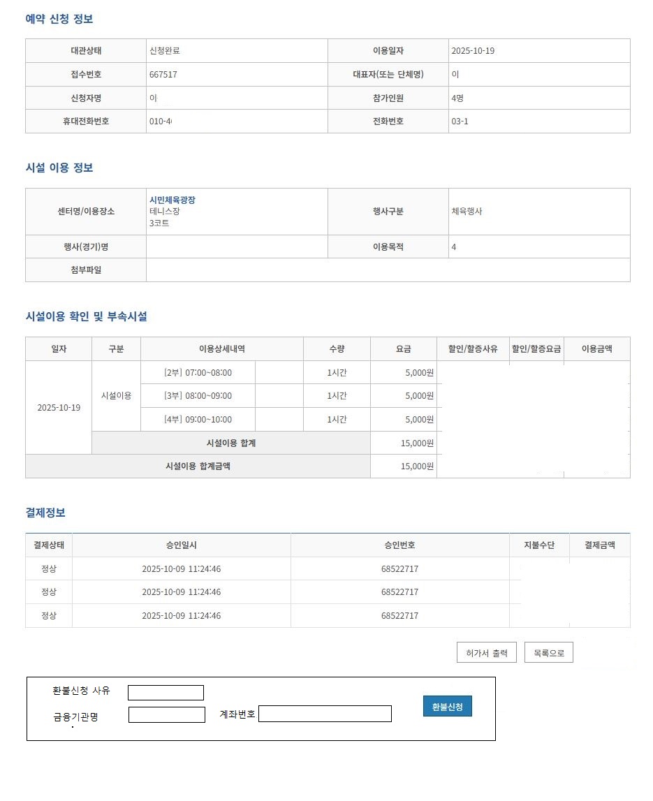 환불 신청서 작성은 마치 담당자가 작성해야 보고서 올려야 하는 문서 업무를 시민에게 전가 시키는 것 같습니다. 웹 페이지에 마이페이지 - 대관내역 - 환불신청 절차에 들어갔다는 것은 이미 문서에 작성해서 넣어야 할 정보가 다 입력된 사항입니다. 환불사유와 환불받을 통장 정보만 입력 받으면 되는 것을 마치 보고서 작성하듯 문서를 작성해서 메일로 보내는 것은 비효울적이고 비 합리적입니다. 간단한 환불정보관련 정보만 입력할 수 있도록 화면 하나 더 만들어 주셨으면 합니다. 첨부한 파일 "환불신청서2" 과 같이 간단하게 만들어 주시기 부탁드립니다.