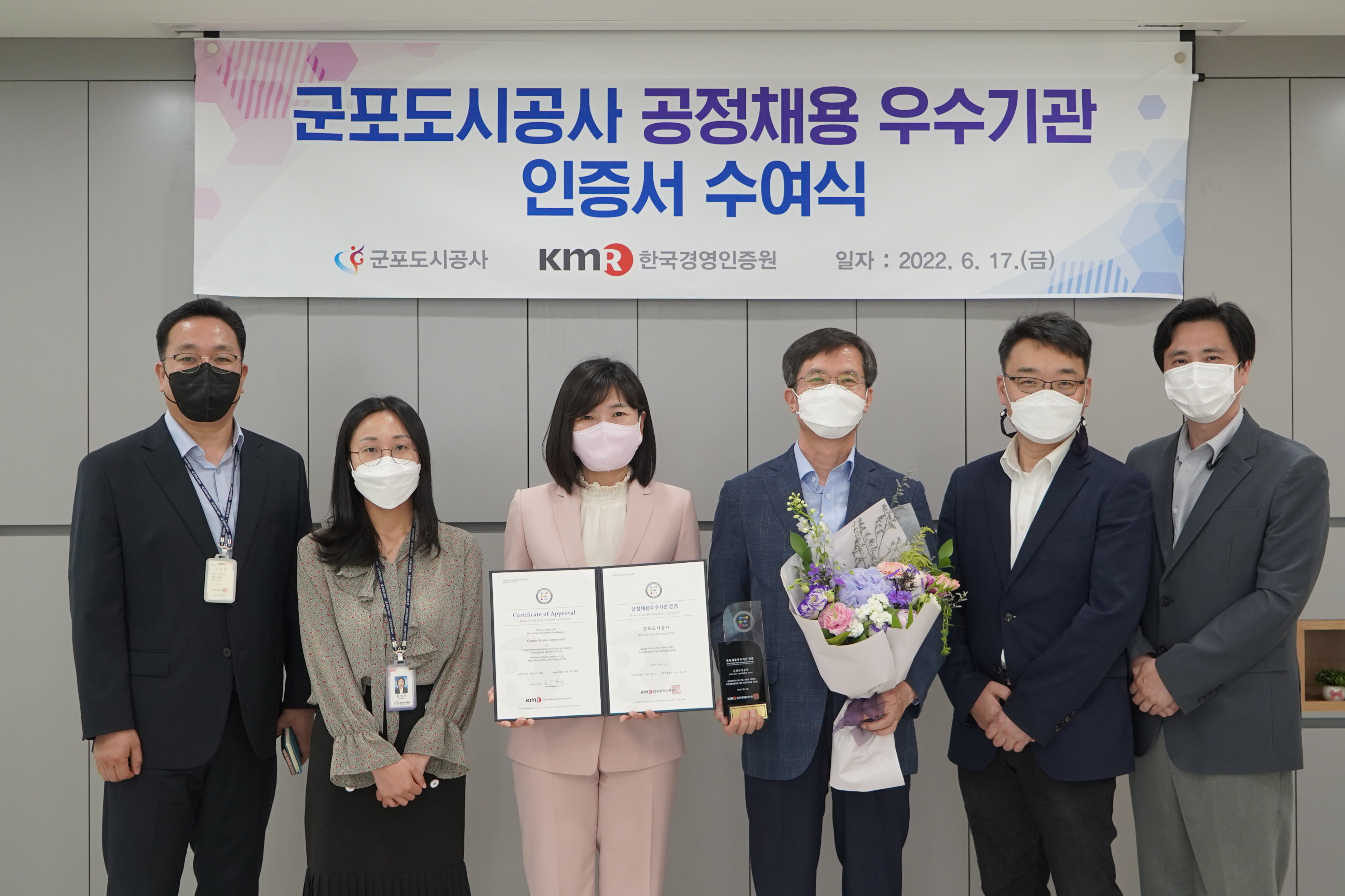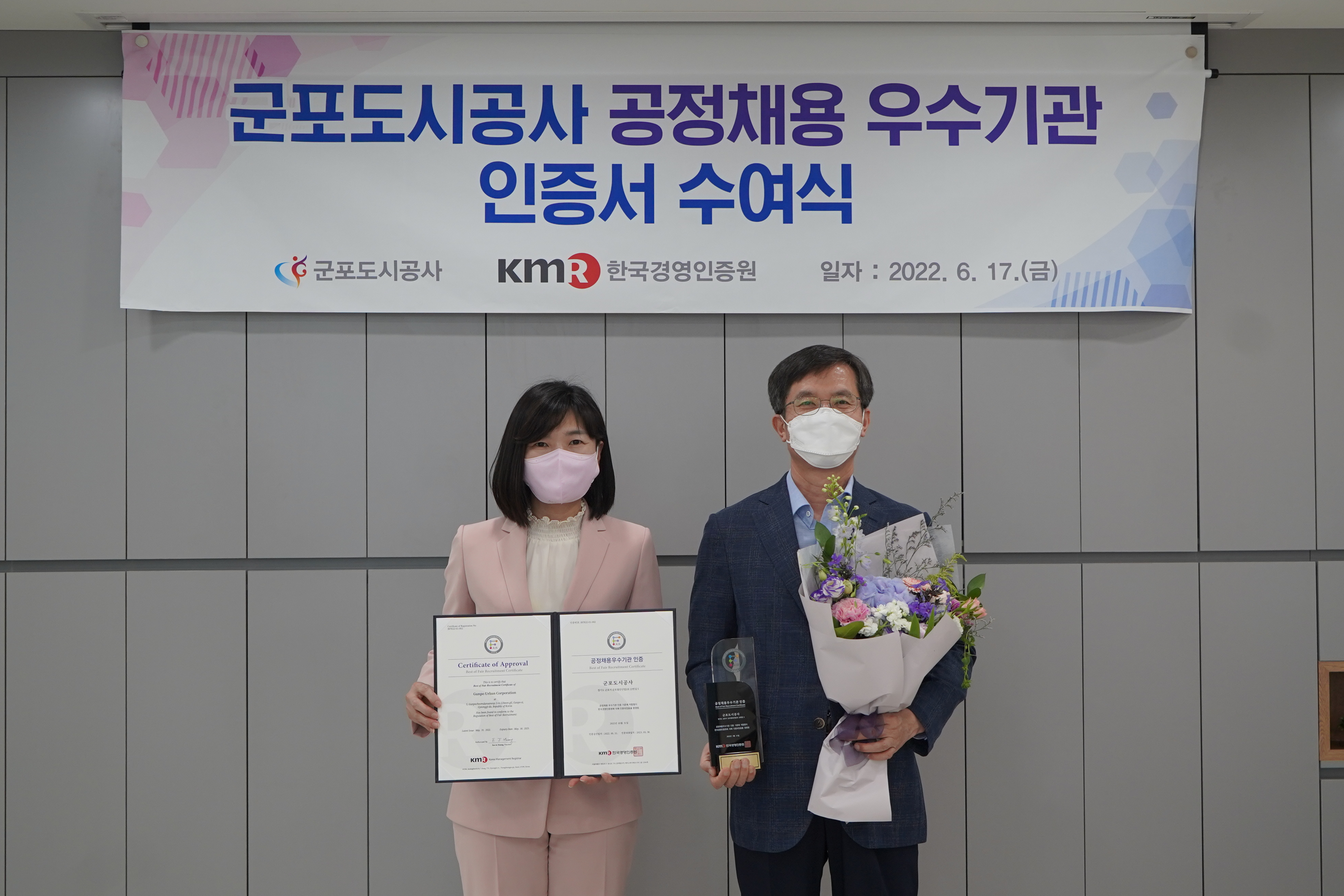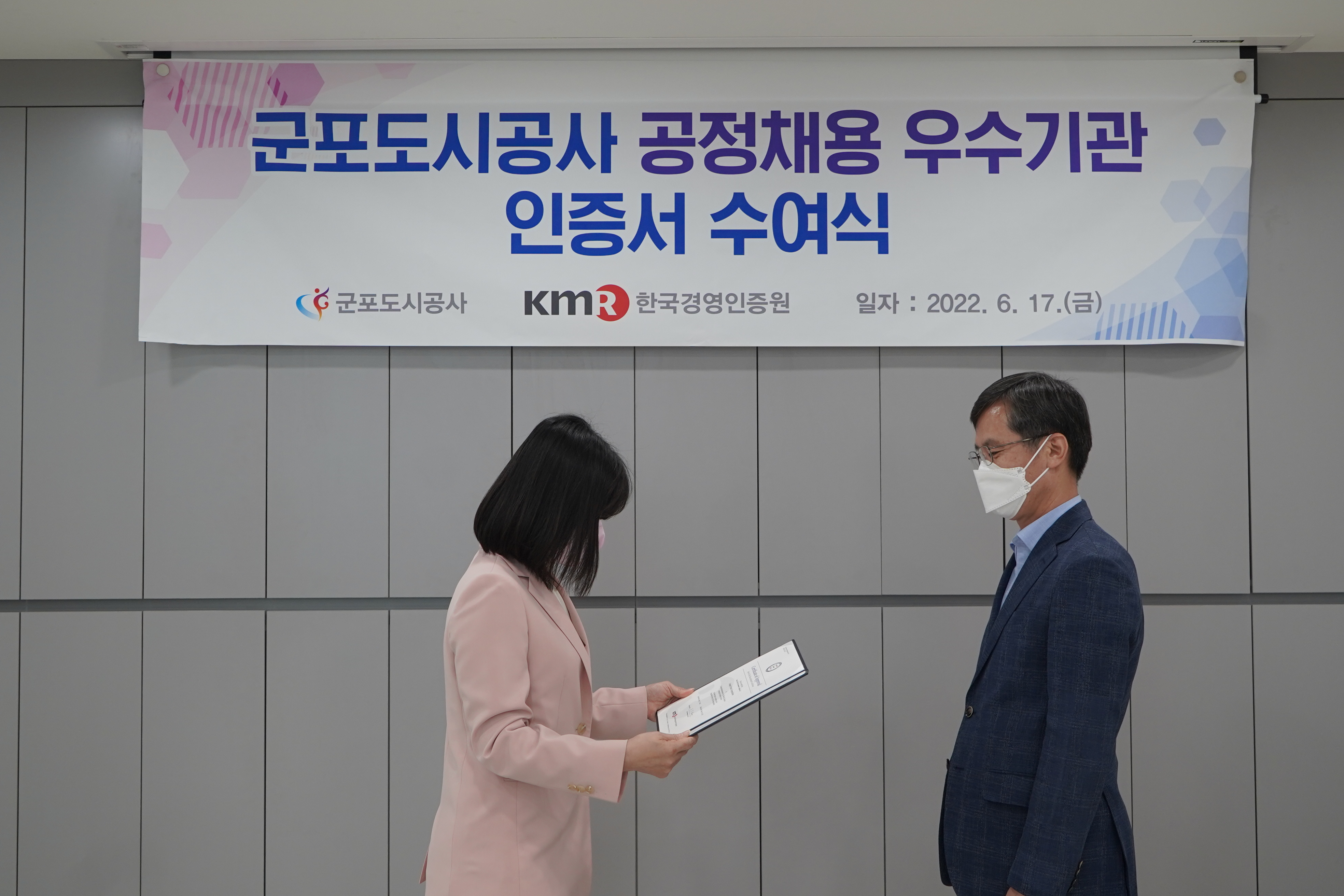 2022-06-17 군포도시공사, 공정채용 우수기관 인증 취득 작성자 CS담당자 등록일자 2022년 6월 20일 10시 10분 33초 조회 371 2022년 6월 17일군포도시공사, 공정채용 우수기관 인증 취득 공정채용 우수기관 인증제도는 채용에 편견적 요소를 배제하고 직무능력중심의 공정채용을 모범적으로 운영하는 공공기관과 기업을 대상으로 전문인증기관의 심사를 통하여 인증을 부여하는 제도입니다. 사진1.JPG [ Size : 2.76MB , Down : 93 ] 미리보기 다운로드 사진2.JPG [ Size : 2.23MB , Down : 90 ] 미리보기 다운로드 사진3.JPG [ Size : 2.35MB , Down : 87 ] 미리보기 다운로드 사진4.JPG [ Size : 2.77MB , Down : 91 ] 미리보기 다운로드 목록보기