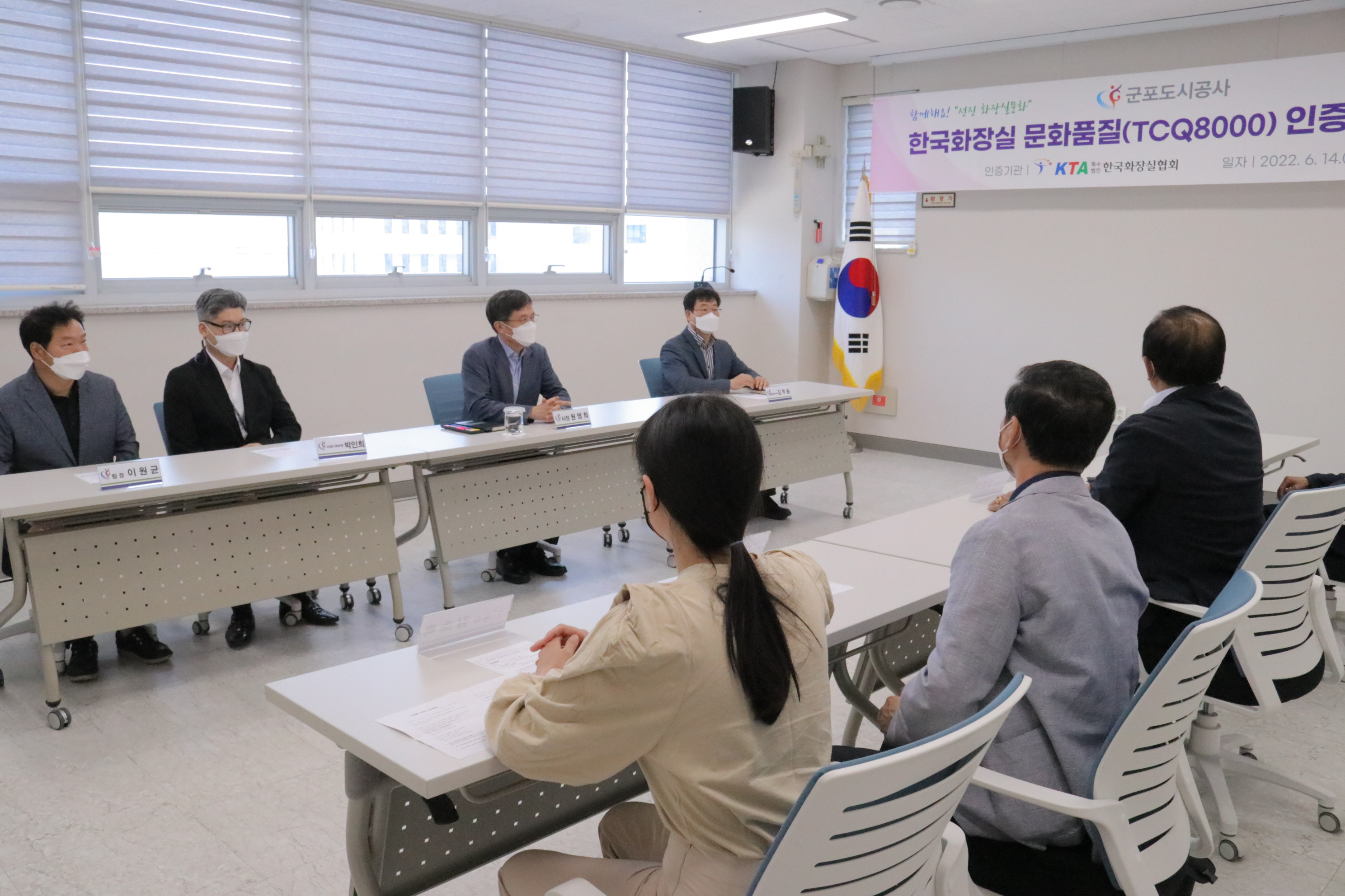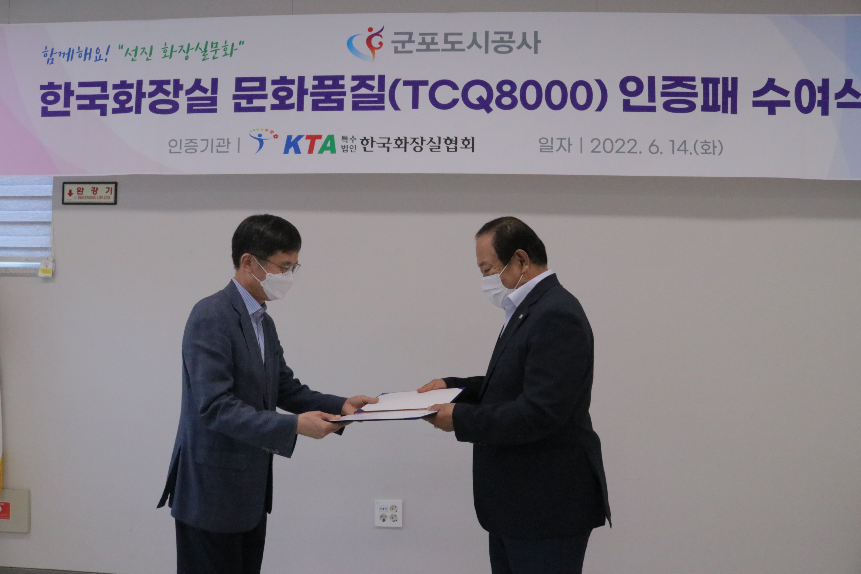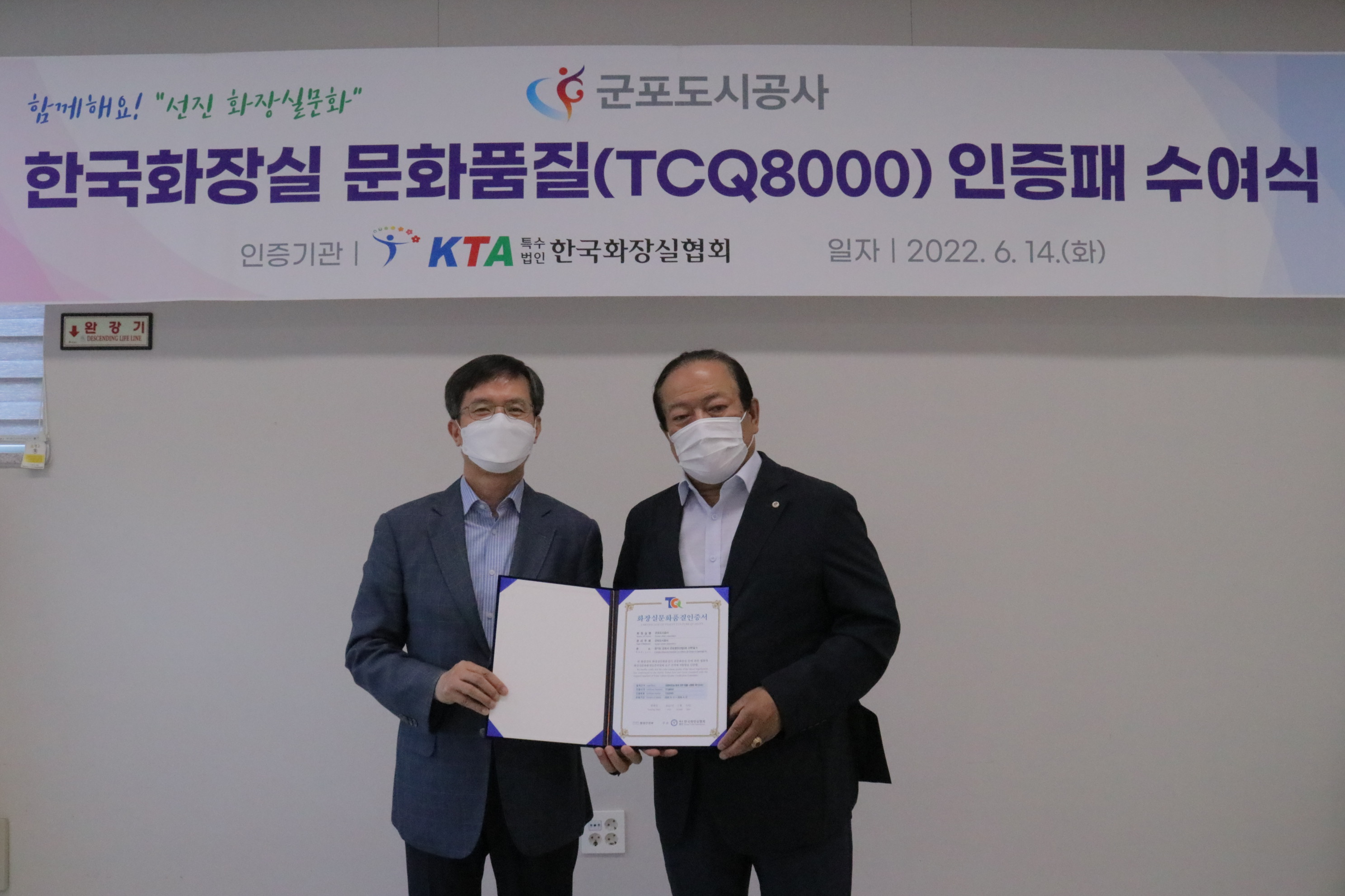 2022-06-14 한국화장실 문화품질(TCQ8000)인증패 수여식 작성자 CS담당자 등록일자 2022년 6월 14일 13시 34분 19초 조회 367 2022년 6월 14일한국화장실 문화품질(TCQ8000) 인증패 수여식군포도시공사는 화장실문화품질이 공중화장실 등에 관한 법률과 화장실문화품질인증위원회 요구 규격에 적합함을 인증받았습니다 ★ 사진1.JPG [ Size : 938.54KB , Down : 94 ] 미리보기 다운로드 사진2.JPG [ Size : 942.67KB , Down : 96 ] 미리보기 다운로드 사진3.JPG [ Size : 747.73KB , Down : 86 ] 미리보기 다운로드 사진4.JPG [ Size : 755.8KB , Down : 92 ] 미리보기 다운로드 사진5.JPG [ Size : 798.26KB , Down : 89 ] 미리보기 다운로드 목록보기