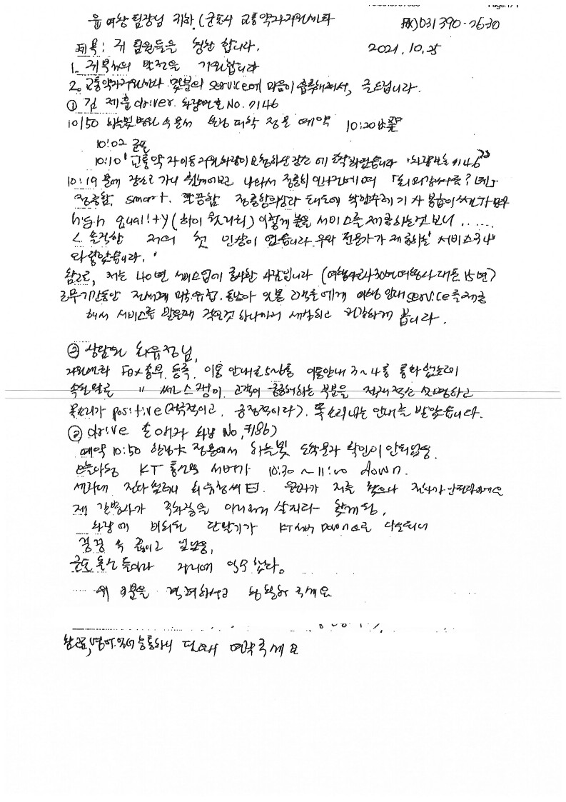 교통복지지원팀 칭찬글 올립니다. 작성자 양현석 등록일자 2021년 10월 25일 19시 52분 38초 조회 549 교통관리부 교통복지지원팀 양현석 대리입니다.사무실 업무용 팩스로 전송된 고객님의 칭찬글을 대신 게시판에 업로드합니다. 고객 자필작성 칭찬글_1.jpg [ Size : 205.8KB , Down : 302 ] 미리보기 다운로드 목록보기