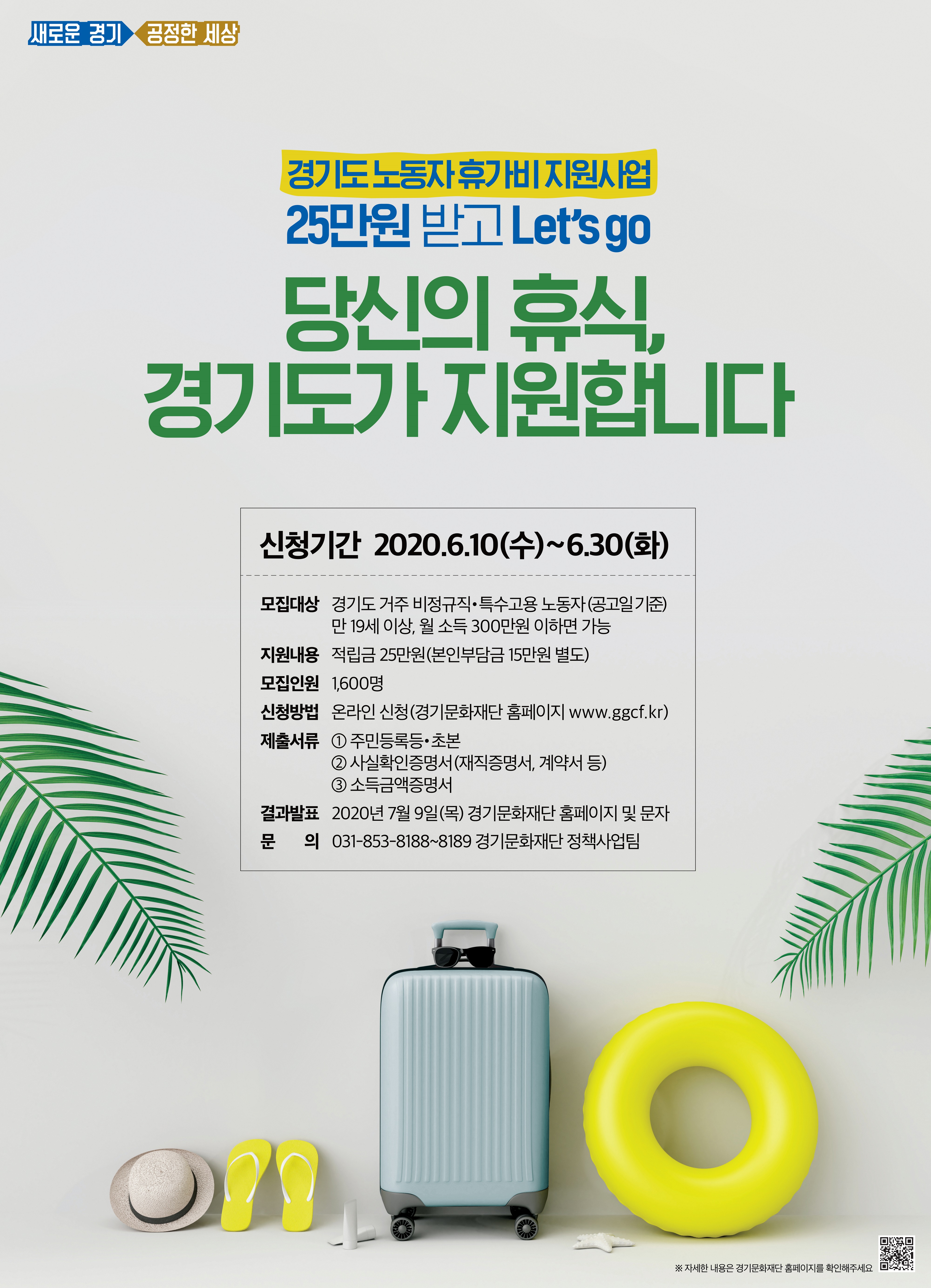 경기도에서는 도내 비정규직·특수고용노동자 휴가비를 지원하는 ‘경기도 노동자 휴가비 지원사업’을 추진하오니 해당되시는 분께서는 적극 지원하여 주시기 바랍니다.