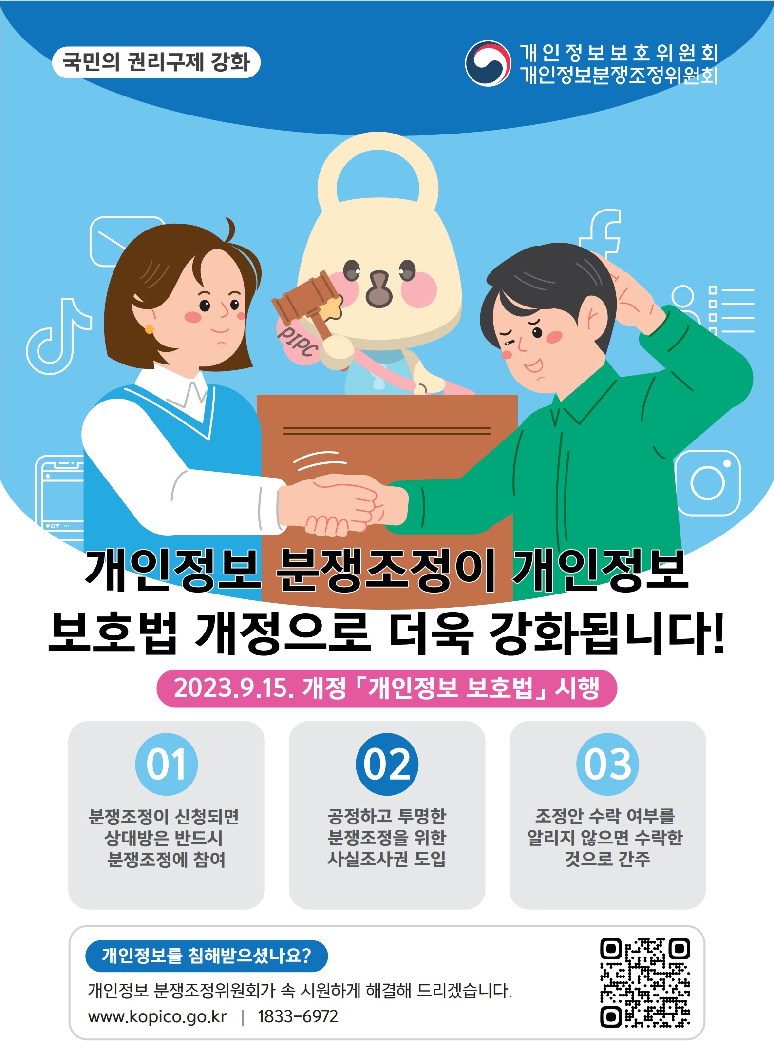 본사 개인정보 분쟁조정제도 안내 작성자 군포도시공사 등록일자 2023년 11월 17일 10시 38분 55초 조회 504 개인정보 분쟁조정제도 포스터.jpg [ Size : 524.18KB , Down : 146 ] 미리보기 다운로드 목록보기