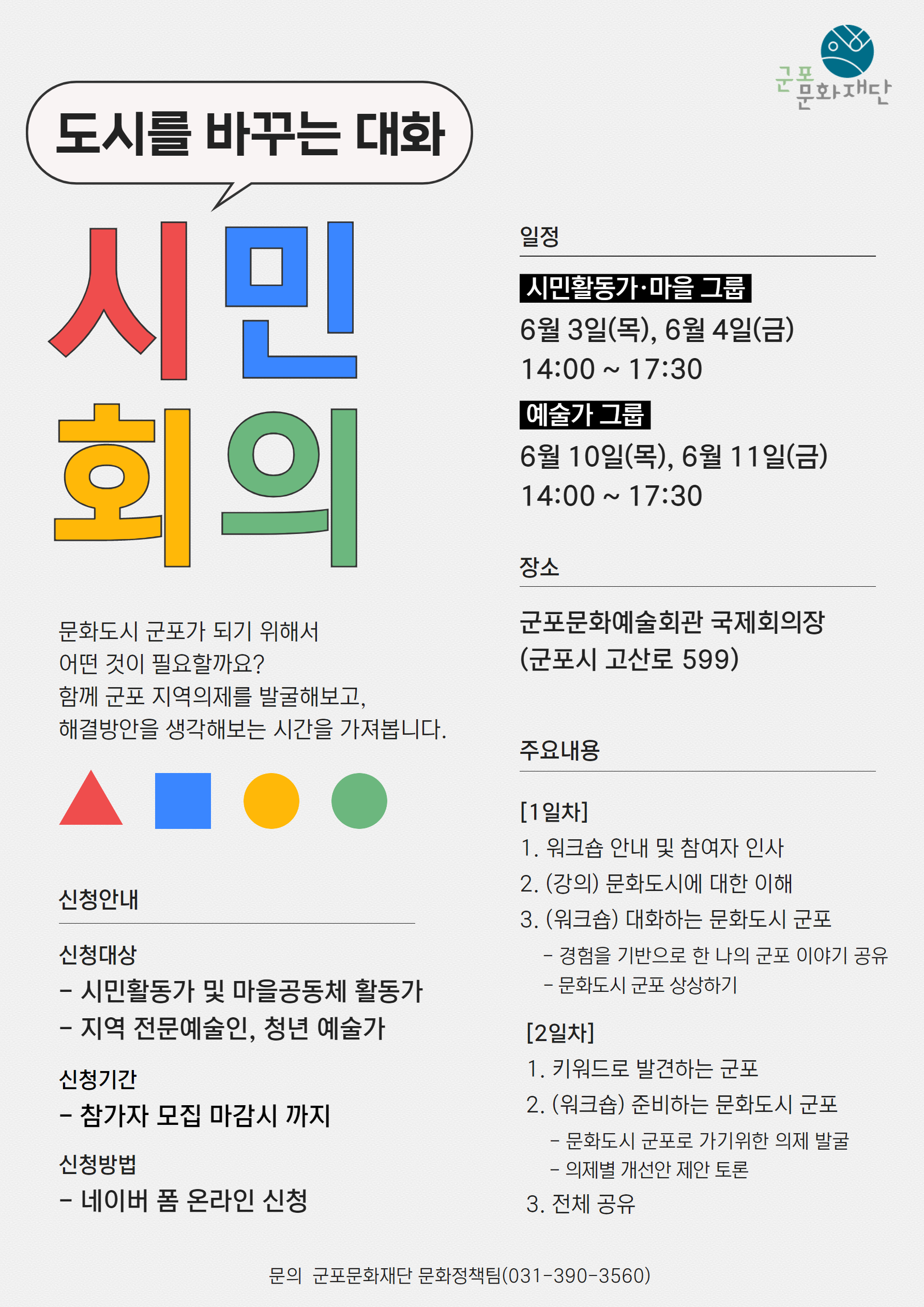 군포문화재단에서 지역의제 발굴을 위한「도시를 바꾸는 대화, 시민회의」 참여자를 아래와 같이 모집하오니 많은 참여 부탁드립니다.