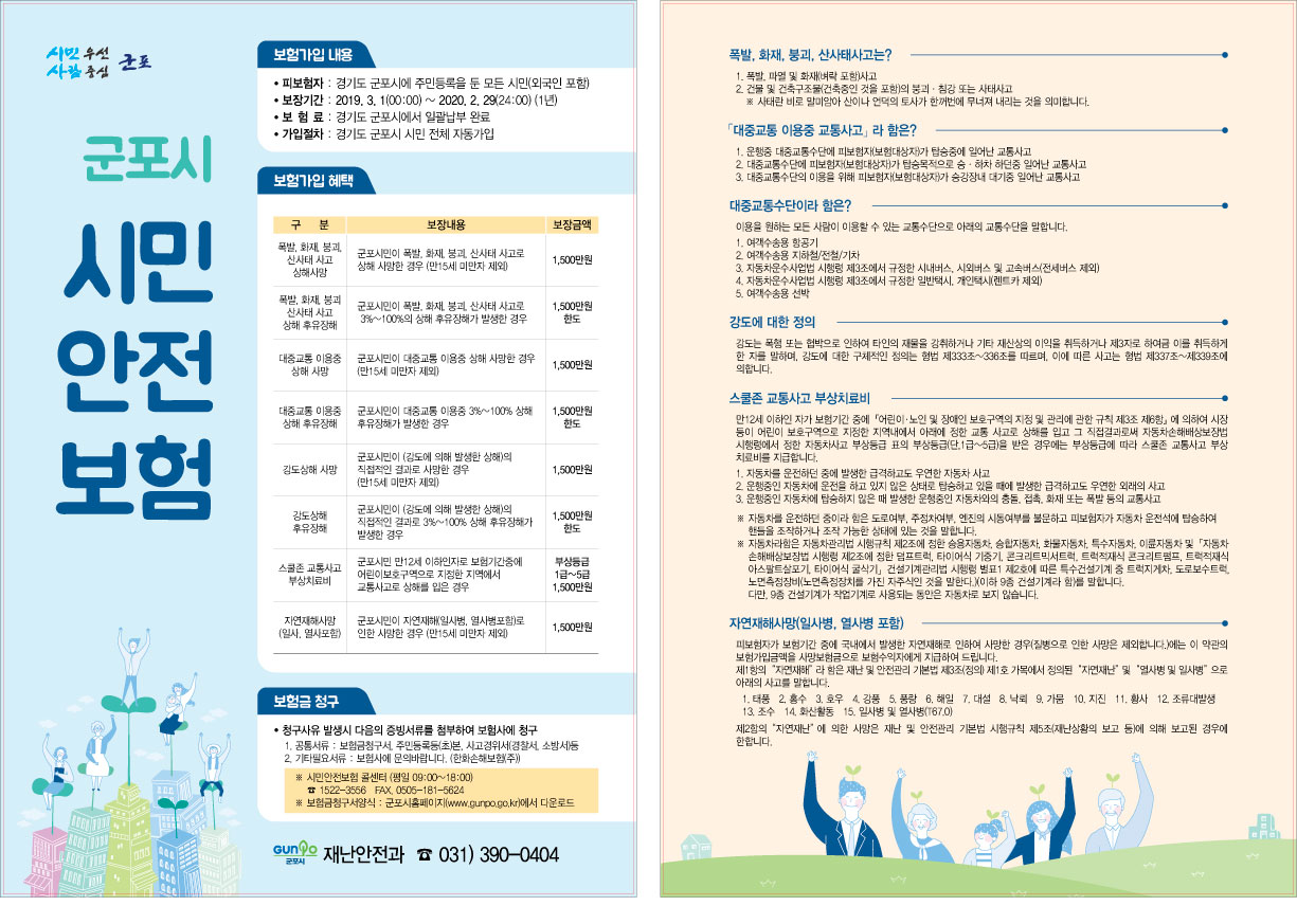 본사 군포시 시민안전보험 실시 안내 작성자 등록일자 2019년 3월 19일 17시 38분 14초 조회 811 이미지가 작아 잘 안보이시면 첨부파일의 포스터를 열어보시기 바랍니다. 시민안전보험 홍보전단.jpg [ Size : 243.22KB , Down : 253 ] 미리보기 다운로드 목록보기