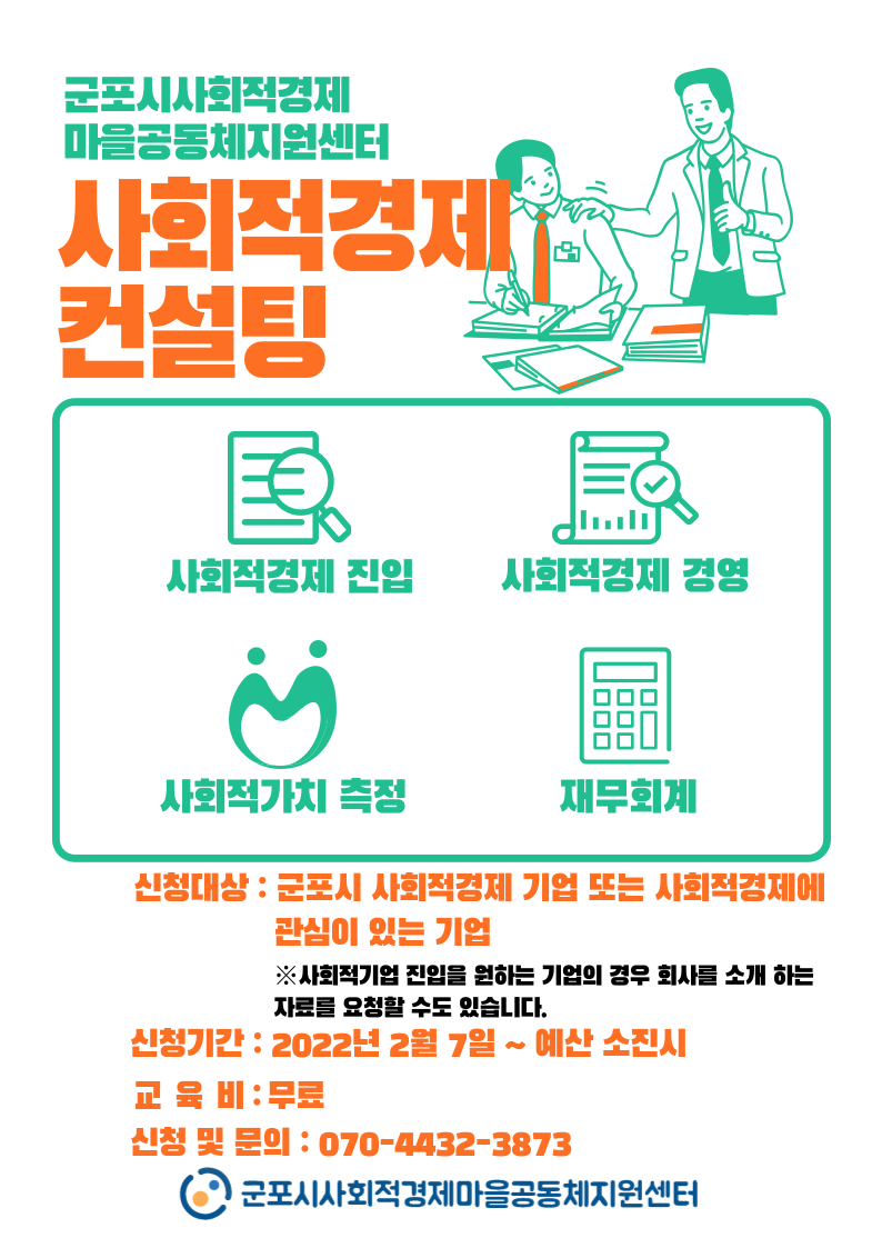 군포시 사회적경제마을공동체지원센터2022-118(2022.02.04.)호와 관련, 군포시 사회적경제·마을공동체지원센터에서 관내 기업 및 사회적경제 조직을 대상으로 1:1 맞춤형 컨설팅을 다음과 같이 진행하고자 하오니 시민들의 많은 참여 부탁드립니다.