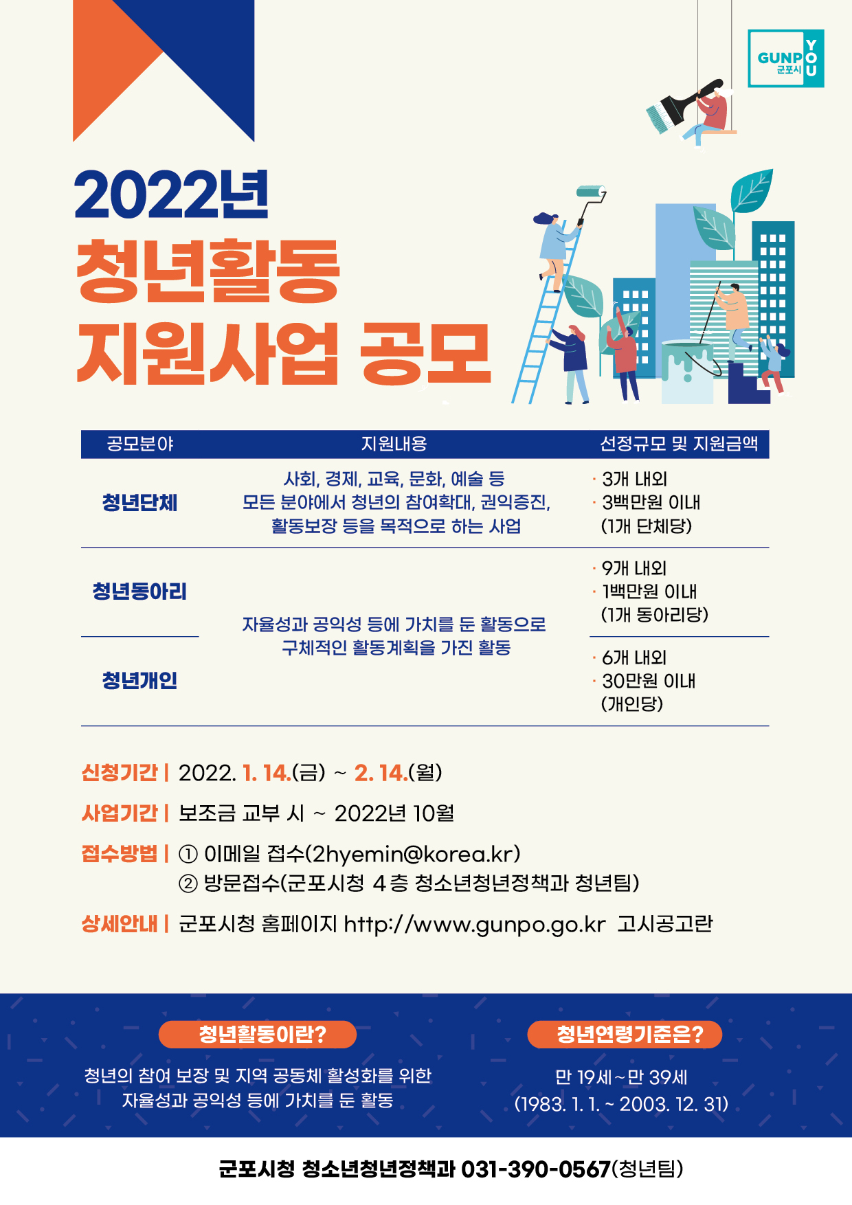 다. 지원대상 : 군포시 거주 또는 군포시 소재 대학 재학이나 직장에 재직 중인 청년을구성원으로 하는 개인, 동아리 또는 단체