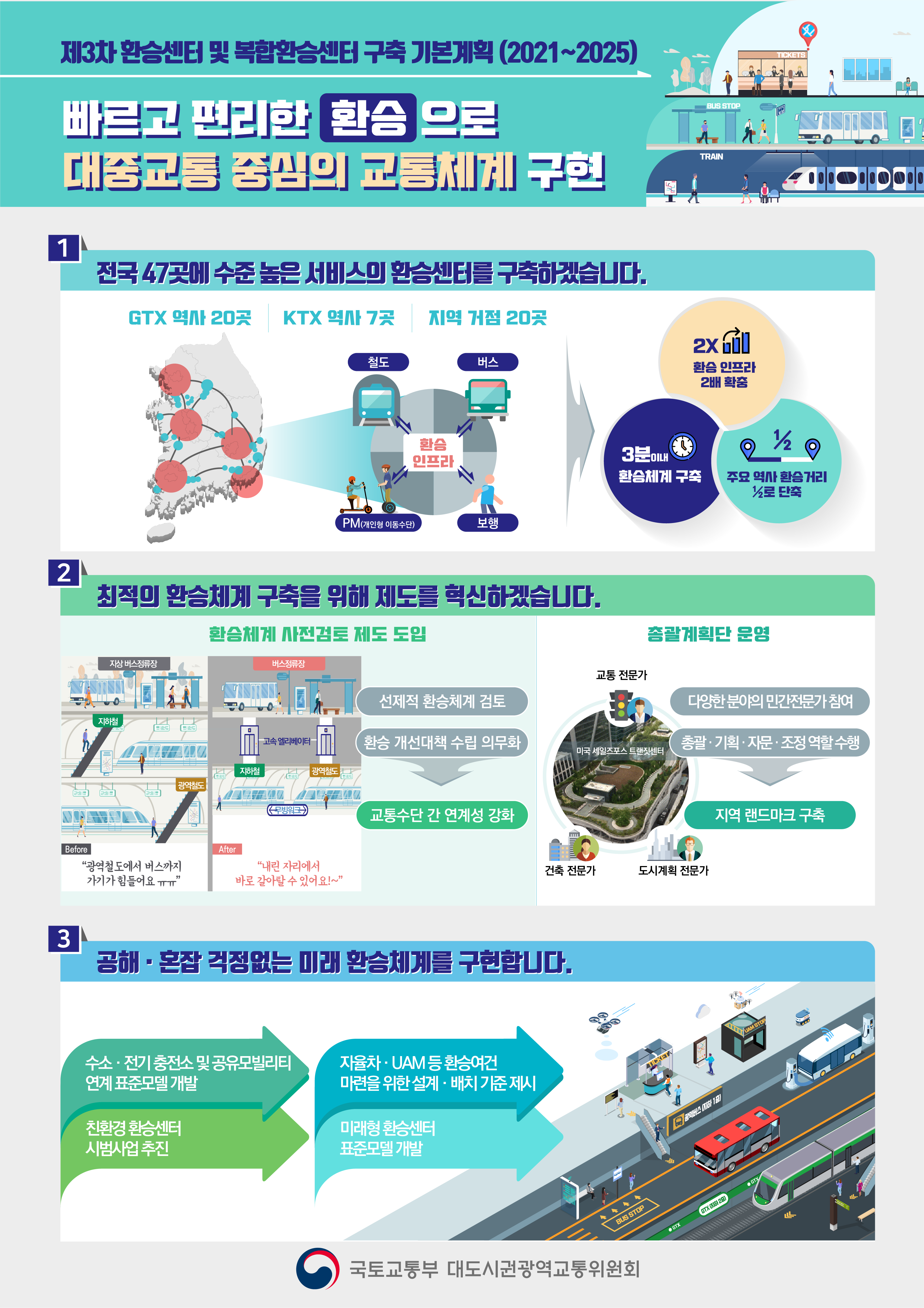 국토교통부 대도시권광역교통위원회에서 「국가통합교통체계효율화법」제44조에 따라 환승센터 및 복합환승센터의 체계적인 구축을 위해 『제3차 환승센터 및 복합환승센터 구축 기본계획(‘21~’25)』을 확정(수립)하였음을 알려드립니다.