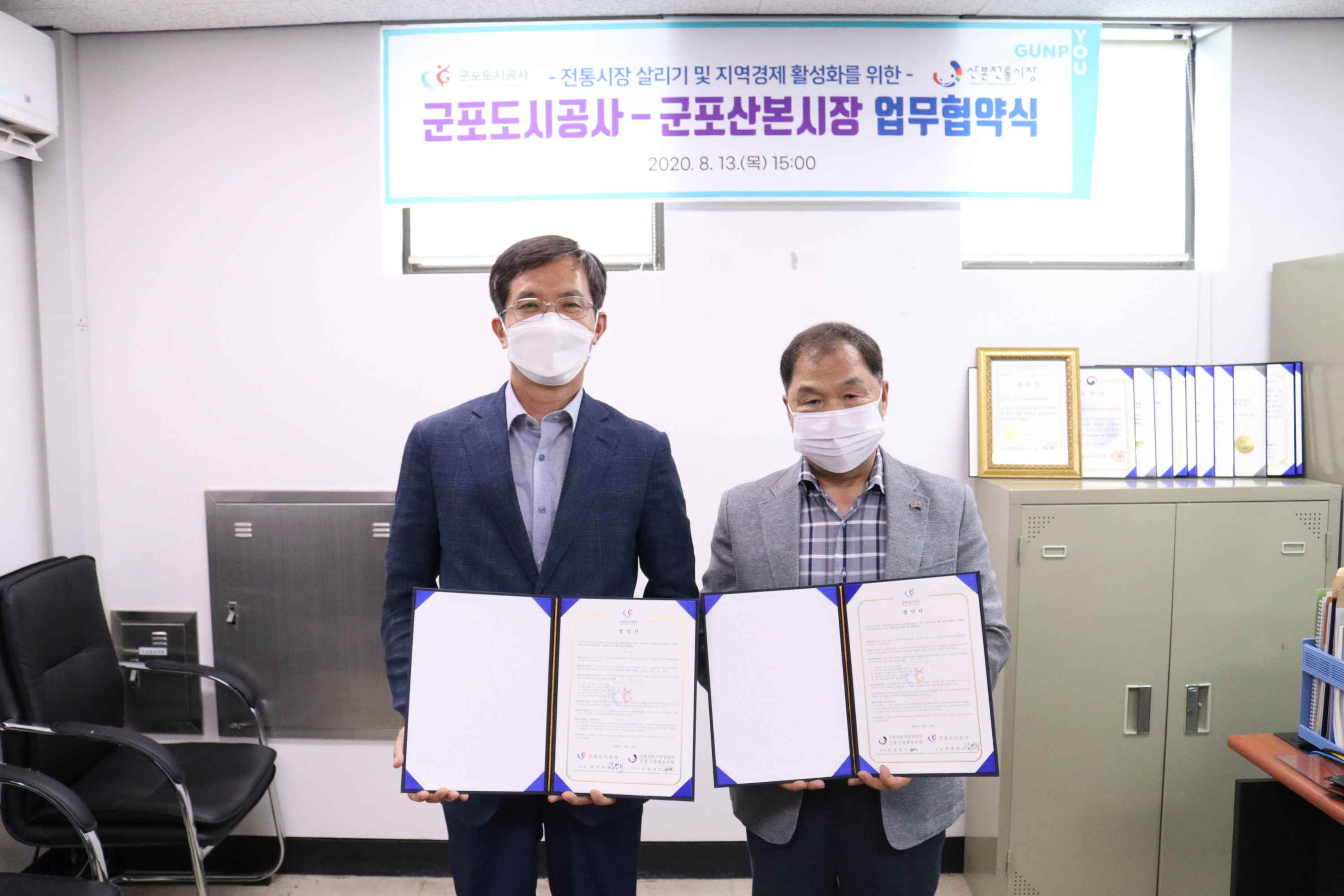 군포도시공사(원명희 사장)는 코로나19 영향으로 침체된 전통시장 살리기에 동참하고자 13일 군포산본시장상점가진흥사업협동조합(김장곤 이사장)과 업무협약을 체결했다.