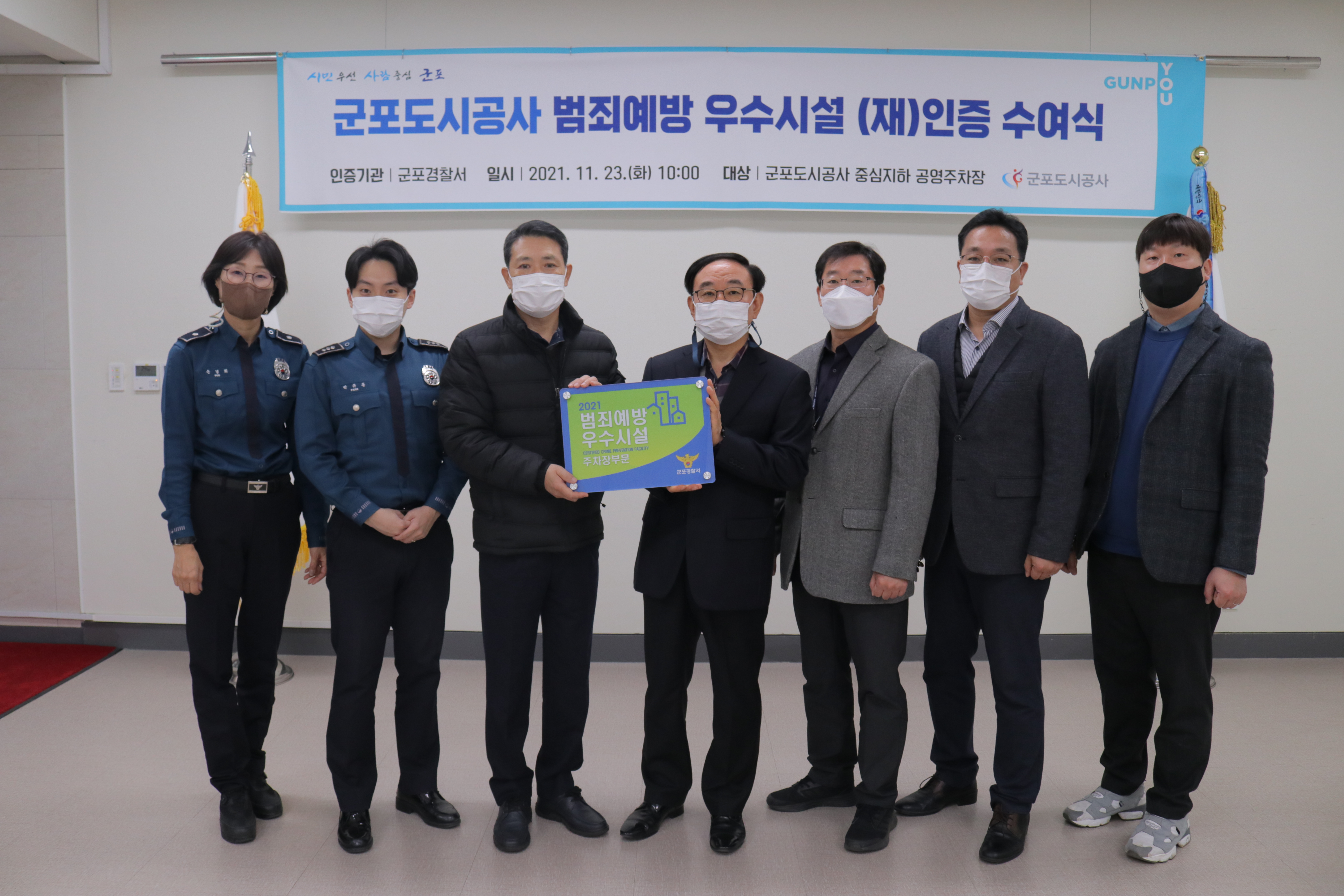 군포도시공사(사장 원명희)는 11월 23일 군포경찰서로부터 범죄예방우수시설(주차장 부문) 인증패를 수여받았다고 밝혔다.