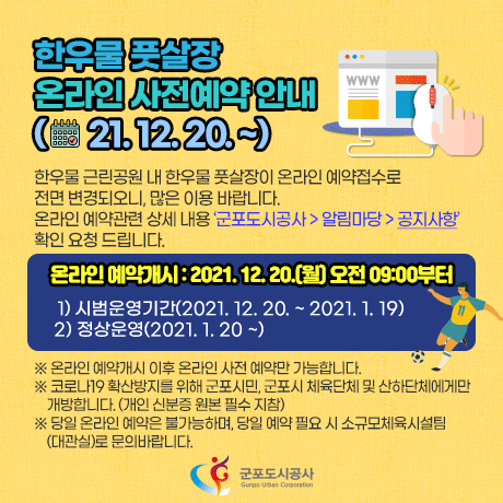 군포도시공사(사장 원명희)는 한우물근린공원(당정동 181-44) 내 체육시설(풋살장, 다목적운동장)에 대해 군포시로부터 수탁을 받아 사전예약시스템을 도입하여 12월 20일부터 본격 운영하게 되었다고 밝혔다.