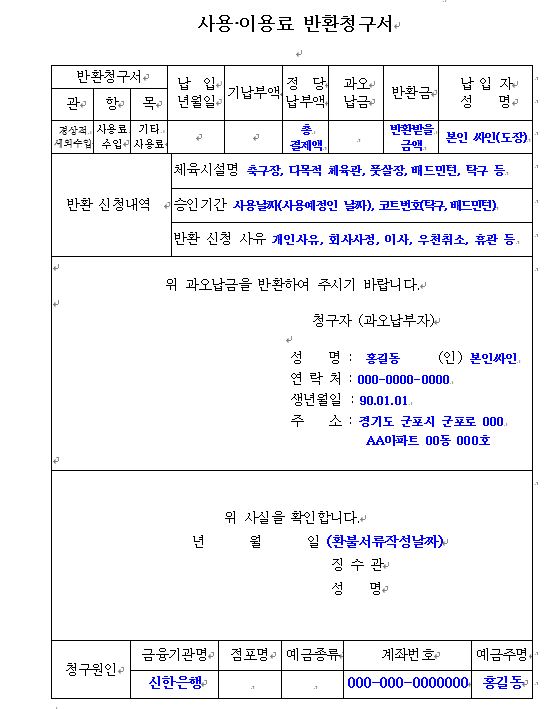 환불 신청서 작성은 마치 담당자가 작성해야 보고서 올려야 하는 문서 업무를 시민에게 전가 시키는 것 같습니다. 웹 페이지에 마이페이지 - 대관내역 - 환불신청 절차에 들어갔다는 것은 이미 문서에 작성해서 넣어야 할 정보가 다 입력된 사항입니다. 환불사유와 환불받을 통장 정보만 입력 받으면 되는 것을 마치 보고서 작성하듯 문서를 작성해서 메일로 보내는 것은 비효울적이고 비 합리적입니다. 간단한 환불정보관련 정보만 입력할 수 있도록 화면 하나 더 만들어 주셨으면 합니다. 첨부한 파일 "환불신청서2" 과 같이 간단하게 만들어 주시기 부탁드립니다.