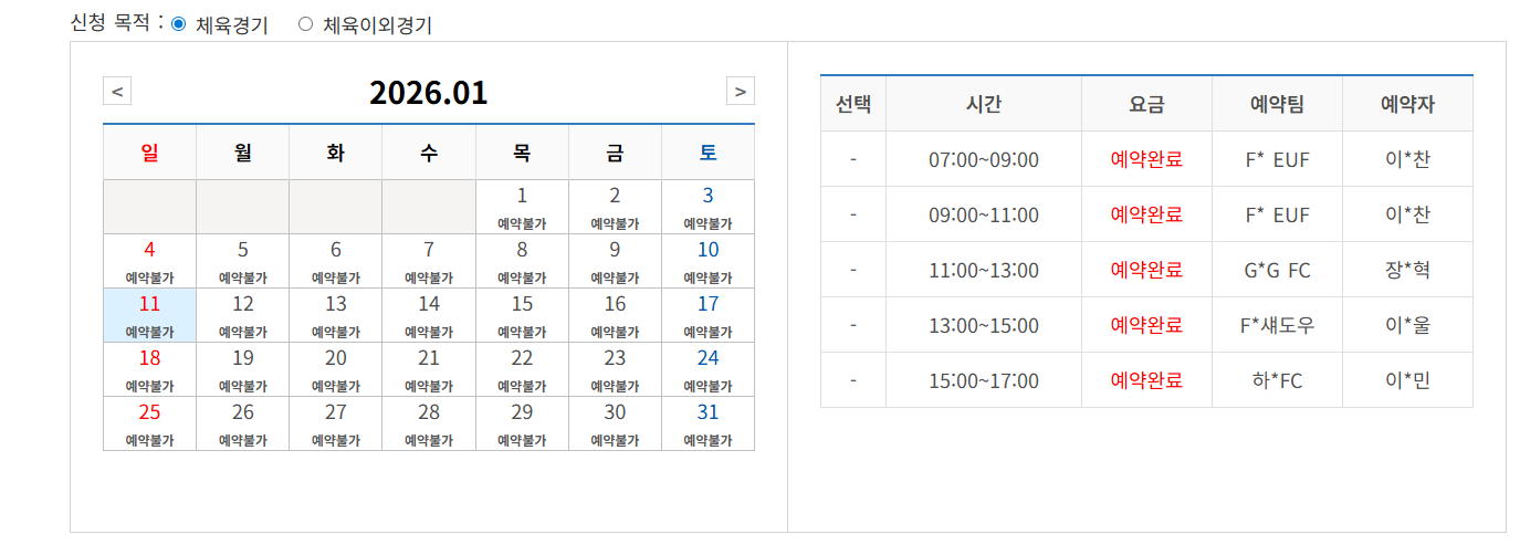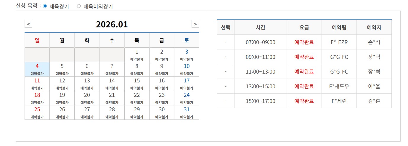 안녕하세요. 지난번에도 동일한 내용으로 민원을 제출했고 전화로 답변까지 받았지만, 실제 운영 방식은 전혀 개선되지 않았습니다. 현재 특정 팀이 경기장 2타임을 연속해서, 그것도 여러 차례 예약하는 사례가 계속 발생하고 있습니다. 축구장 자체가 부족해 일반 사용자들은 예약하기가 매우 어려운 상황인데, 이러한 불공정한 예약 운영은 납득하기 어렵습니다. 이미 같은 문제로 민원을 제기한 상황에서 개선 없이 동일한 일이 반복된다는 점은 솔직히 말씀드려 운영 측에서 제대로 관리가 이루어지지 않고 있는 것 아닌가 하는 생각이 듭니다. 첨부한 사진을 참고하시어 앞으로 공정한 예약 운영을 위해 재발 방지 대책을 마련해주시기 바랍니다. 빠른 확인과 답변 요청드립니다.