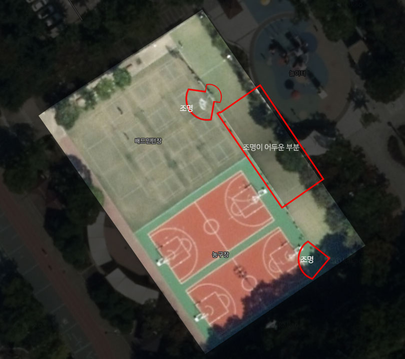 첨부하는 이미지처럼 테스니스장 영역에서 가운데 부분이 너무 어둡습니다. 애초에 조명탑이 테니스장쪽을 등지고 공원쪽으로 설치된후 나중에 뒤편에 조명을 추가해 테니스장쪽을 밝히고 있는것으로 알고 있습니다. 그런데 테니스장 2면이 길게 붙어있는데, 이중에 가운데 부분으로 비추는 조명이 약하다보니 너무 어둡습니다. 조명타워에 테니스장 가운데쪽을 비추는 조명을 추가해주시면 좋겠습니다. 추가로, 1. 테니스장 바닥이 공원 벽쪽으로 땅이 꺼져있는 상태입니다. 2. 인조잔디를 공사할때 짜투리를 이어붙여 작업했는지, 면이 고르지 않고 이어 붙인면에 턱이 생기다보니 공 바운드가 너무 불규칙하네요. 군포시민의 건강을 위해 열심히 시설관리에 힘쓰고 계신줄 압니다. 위와 같은 아쉬운 부분에 좀더 신경써주시면 감사하겠습니다.