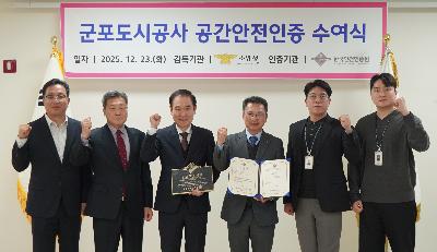 게시판 검색 표시줄수 : 3개씩 보기6개씩 보기9개씩 보기12개씩 보기15개씩 보기18개씩 보기21개씩 보기24개씩 보기27개씩 보기30개씩 보기 검색 대상 : 전체 검색제목내용 검색어 : 검색 총 358건(1/40페이지) 2026-01-20 송정복합체육센터 2025년 장애인 이용편의 최우수 체육시설’ 문화체육관광부 장관 표창 수상 2026-01-02 2026년 시무식 2025-12-31 2025년 종무식 2025-12-23 송정복합체육센터 '공간안전인증' 취득 2025-12-16 산본동 일원 복합개발사업 주민기획단 위촉식 개최 2025-12-18 ‘2025년 저탄소 어워즈’ 지방공기업 부문 ‘저탄소 대상’ 수상 2025-12-18 '우리동네 1사-1시장 협력 프로젝트' 중기부 장관상 수상 2025-12-17 산본로데오공영주차장 화장실문화품질 인증 2025-12-11 'AI 안전 인증' 경기도 지방공사·공단 최초 취득 ◀ 1 2 3 4 5 6 7 8 9 10 다음 ▶