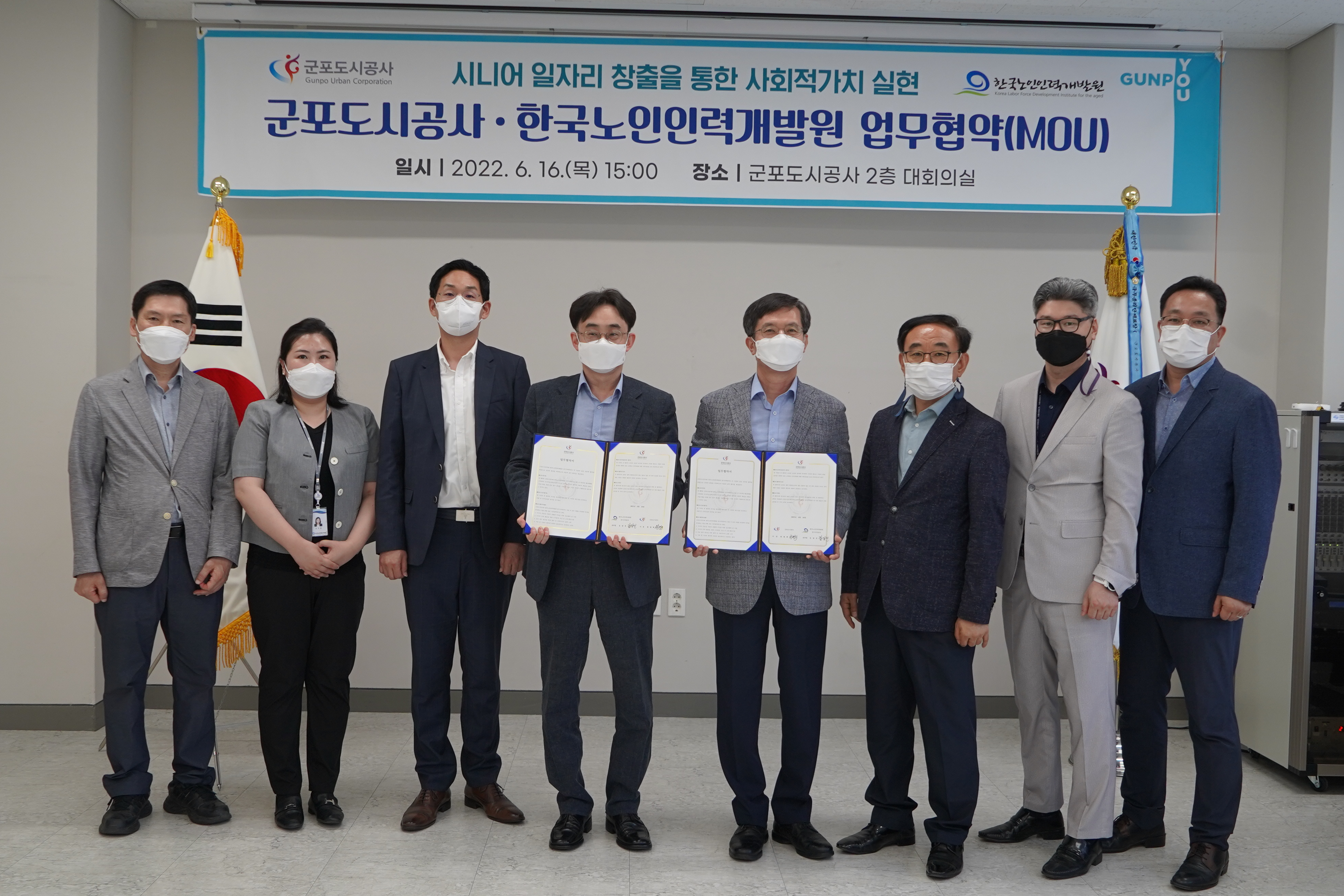 2022-06-16 군포도시공사-한국노인인력개발원 업무협약 체결 작성자 CS담당자 등록일자 2022년 6월 16일 17시 27분 1초 조회 394 2022년 6월 16일군포도시공사-한국노인인력개발원 업무협약 체결군포도시공사는 시니어 일자리 창출을 위해 한국노인인력개발원과 업무협약을 체결했습니다!한국노인인력개발원의 ‘시니어 인턴십 사업’에 참여하는 등 시니어 일자리 창출에 앞장설 예정입니다 :) 사진1.JPG [ Size : 2.76MB , Down : 91 ] 미리보기 다운로드 사진2.JPG [ Size : 2.91MB , Down : 96 ] 미리보기 다운로드 사진3.JPG [ Size : 2.37MB , Down : 88 ] 미리보기 다운로드 사진4.JPG [ Size : 2.68MB , Down : 101 ] 미리보기 다운로드 사진5.JPG [ Size : 3.06MB , Down : 95 ] 미리보기 다운로드 목록보기