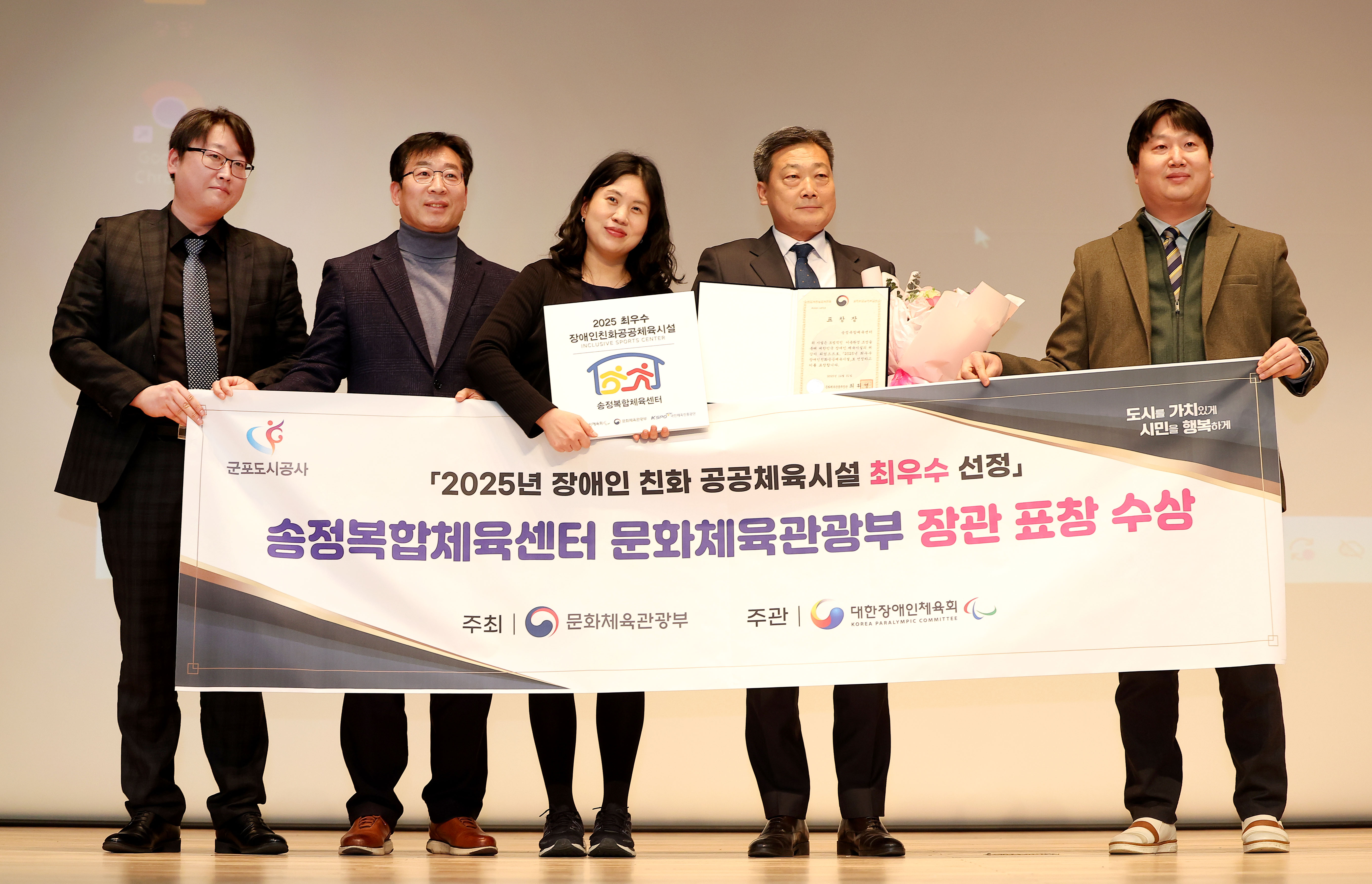 2026-01-20 송정복합체육센터 2025년 장애인 이용편의 최우수 체육시설’ 문화체육관광부 장관 표창 수상 작성자 CS담당자 등록일자 2026년 1월 22일 13시 24분 56초 조회 75 군포도시공사, 송정복합체육센터 ‘2025년 장애인 이용편의 최우수 체육시설' 문화체육관광부 장관 표창 수상.jpg [ Size : 1.68MB , Down : 15 ] 미리보기 다운로드 목록보기