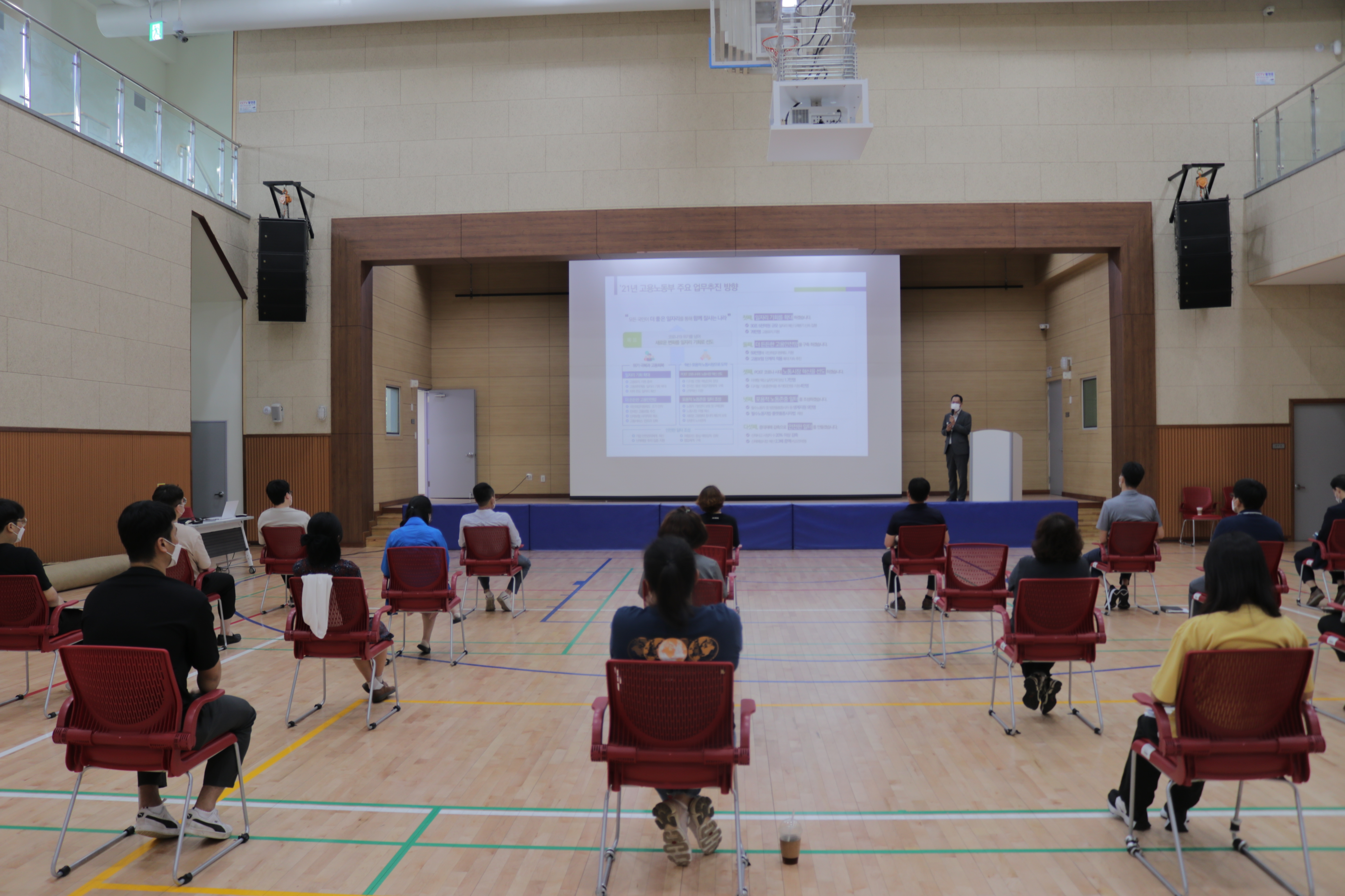 코로나 19 방역을 위해 사회적 거리두기를 실천하며 열심히 교육을 듣는 공사 직원들 !