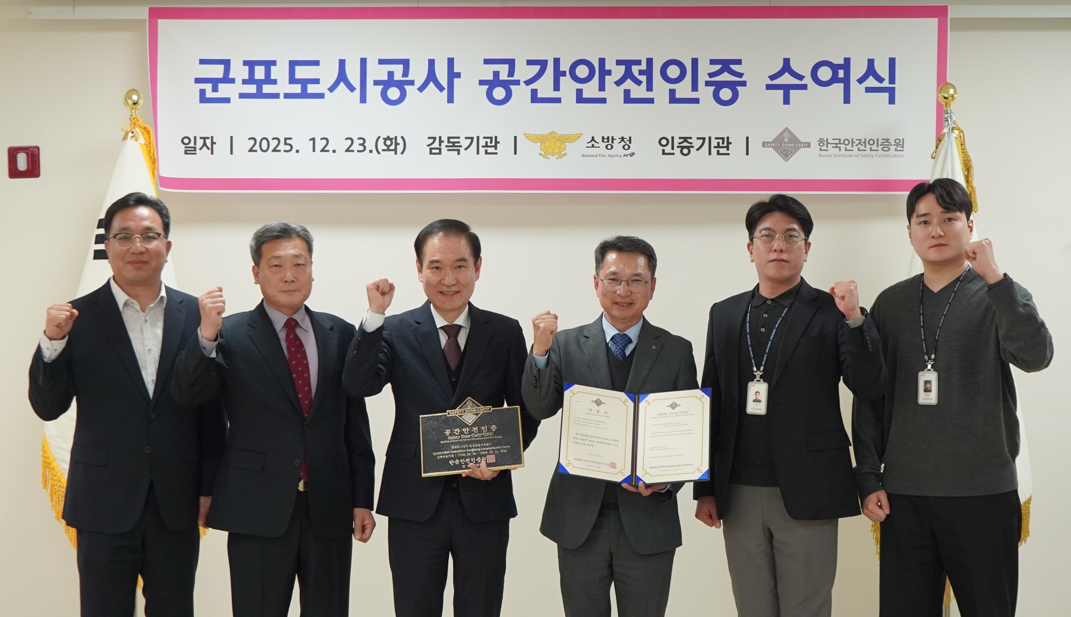2025-12-23 송정복합체육센터 '공간안전인증' 취득 작성자 CS담당자 등록일자 2026년 1월 9일 9시 52분 52초 조회 39 군포도시공사, 송정복합체육센터 ‘공간안전인증’획득.JPG [ Size : 824.7KB , Down : 17 ] 미리보기 다운로드 DSC04196.JPG [ Size : 2.13MB , Down : 17 ] 미리보기 다운로드 DSC04176.JPG [ Size : 2.11MB , Down : 17 ] 미리보기 다운로드 DSC04179.JPG [ Size : 2.41MB , Down : 16 ] 미리보기 다운로드 목록보기