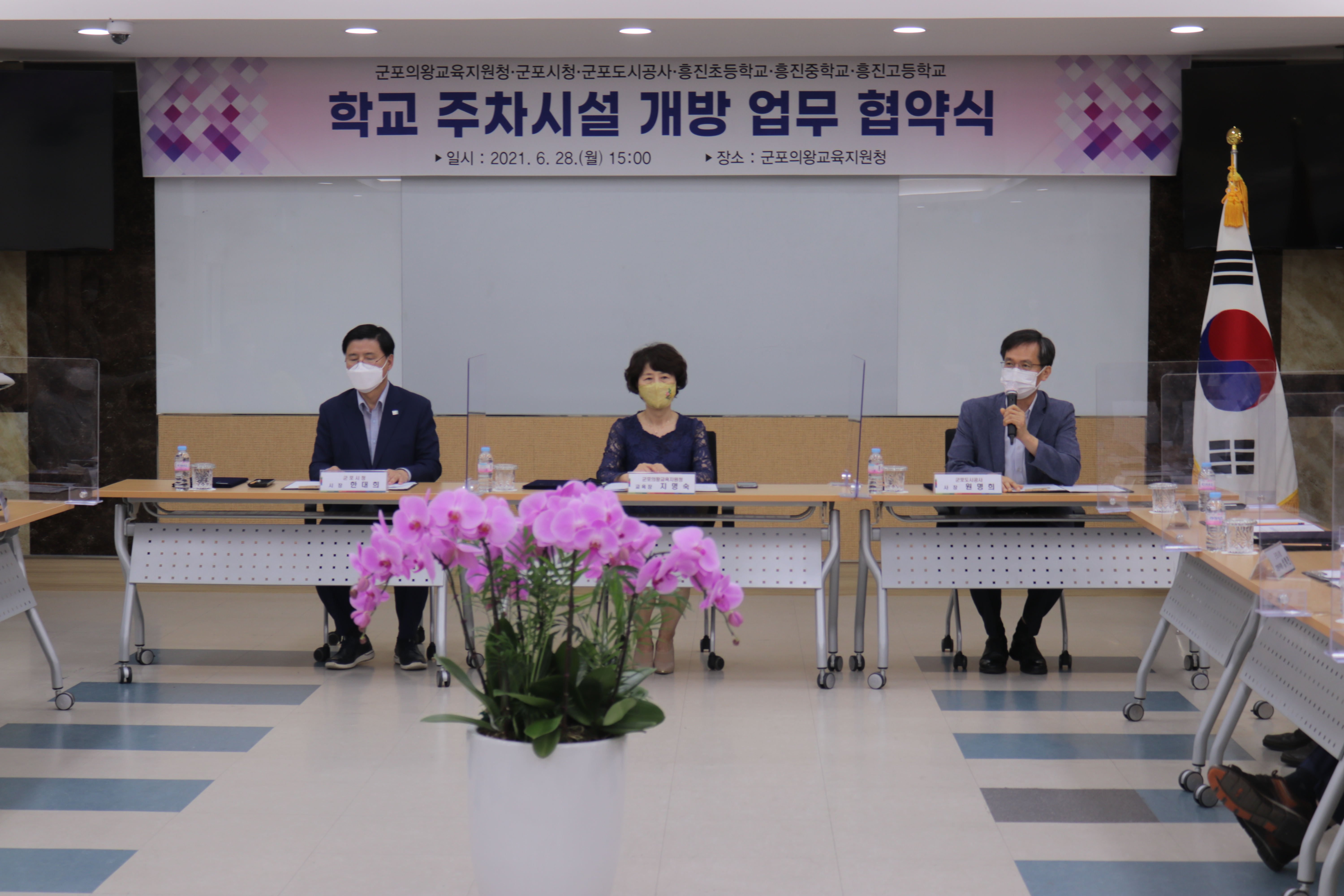 군포시와 군포도시공사, 군포의왕교육지원청, 흥진초·중·고교는 28일 교육지원청 백운홀에서 학교 주차시설 개방에 관한 업무 협약을 체결했다.