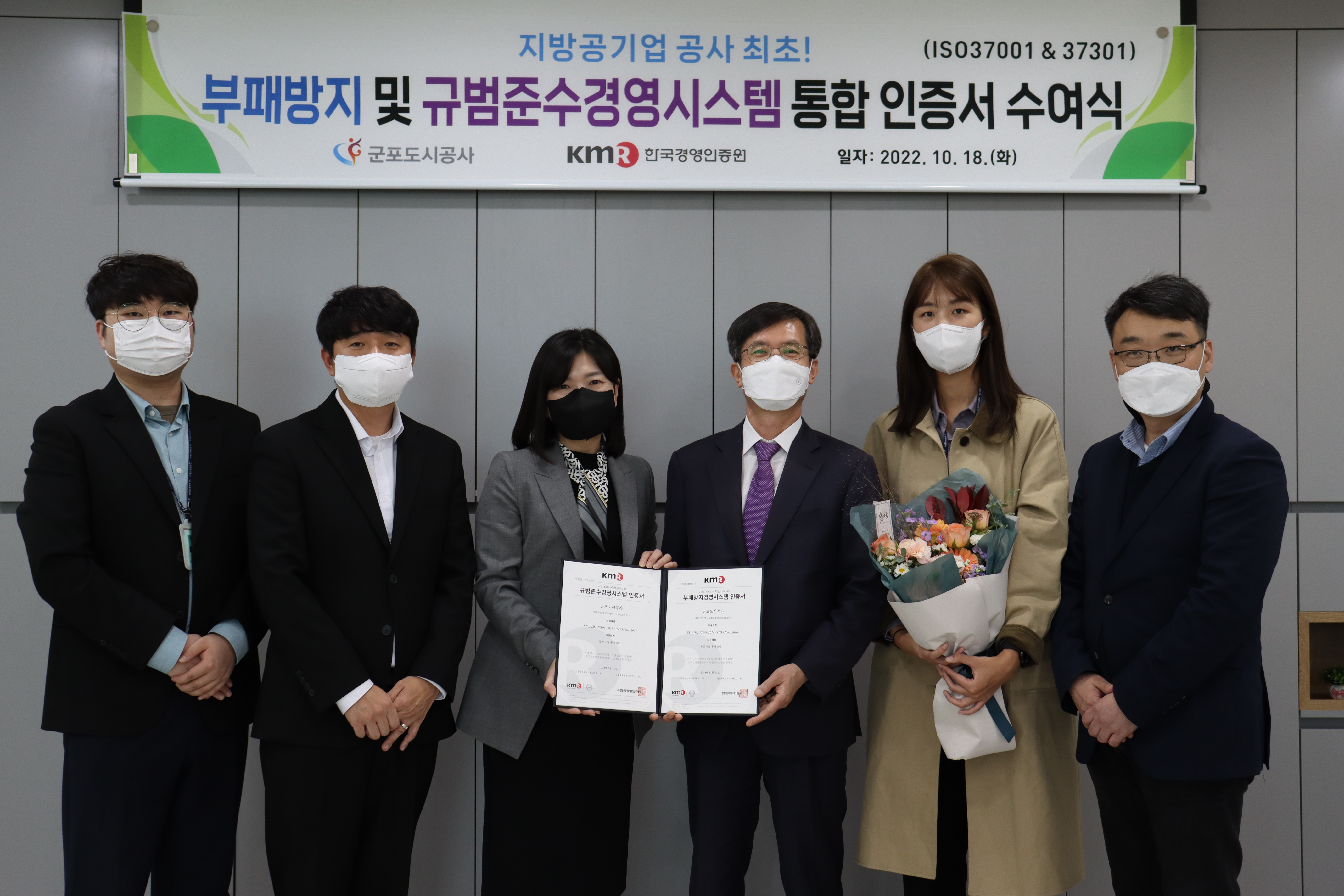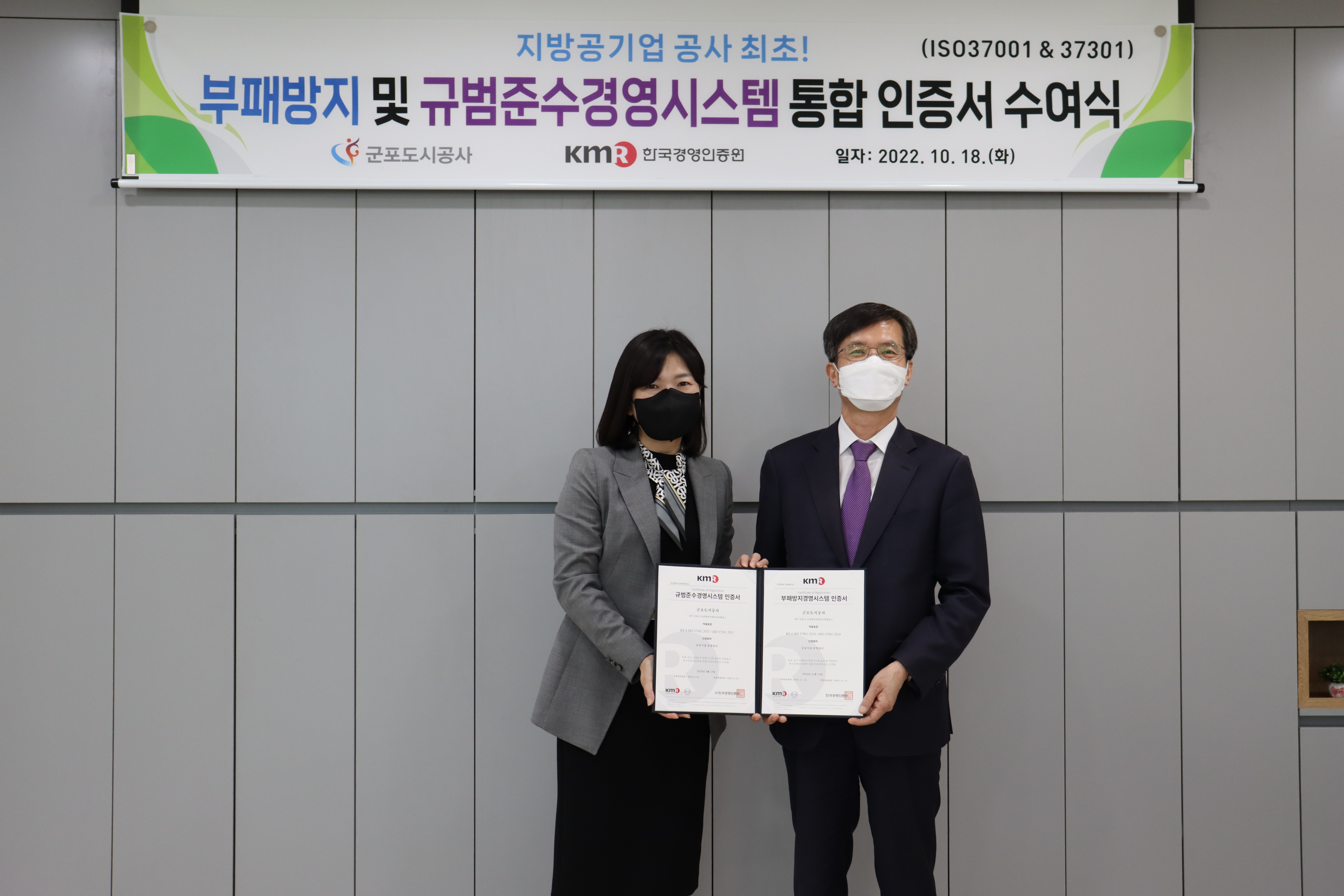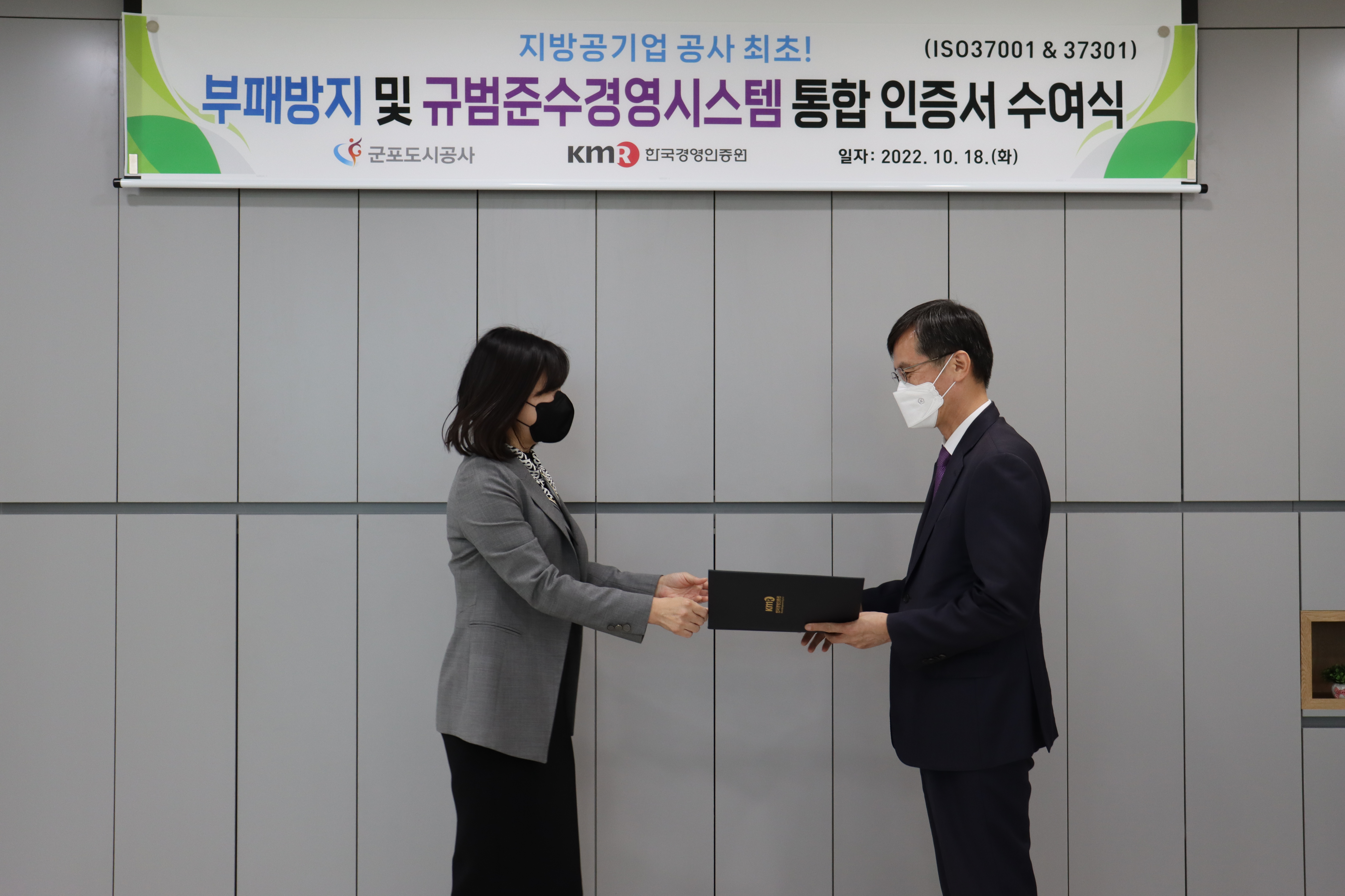 2022-10-18 군포도시공사 '부패방지·규범준수경영시스템' 통합 인증서 수여식 작성자 CS담당자 등록일자 2022년 10월 20일 19시 50분 32초 조회 361 군포도시공사 '부패방지·규범준수경영시스템' 통합 인증 획득!윤리경영 고도화를 위해 규범준수경영 방침 제정, 부서별 리스크 분석 및 개선,내부심사원 양성 등 규범준수경영시스템 도입에 전사적인 노력으로통합 인증을 획득하였습니다. IMG_0148.JPG [ Size : 7.61MB , Down : 103 ] 미리보기 다운로드 IMG_0155.JPG [ Size : 7.7MB , Down : 96 ] 미리보기 다운로드 IMG_0159.JPG [ Size : 7.5MB , Down : 101 ] 미리보기 다운로드 목록보기