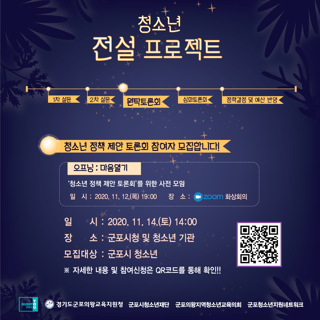 군포시 「100인 위원회」 청소년소위원회에서는 2021년 청소년 정책수립 및 의제발굴을 위해 청소년 대상 1, 2차 설문조사를 실시하였고, 그 결과를 바탕으로 청소년 정책 제안 토론회를 개최하오니 관심있으신 많은 청소년 분들께서는 적극 참석하여주시기 바랍니다.