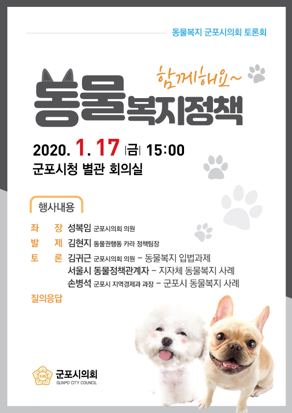 군포시의회에서 아래와 같이 『동물복지정책 토론회』를 개최하오니 군포시 실정에 맞는 정책을 발굴하고 주요 시정 현안사업에 도입할 수 있도록 지역 시민분들의 많은 참석 부탁드립니다.