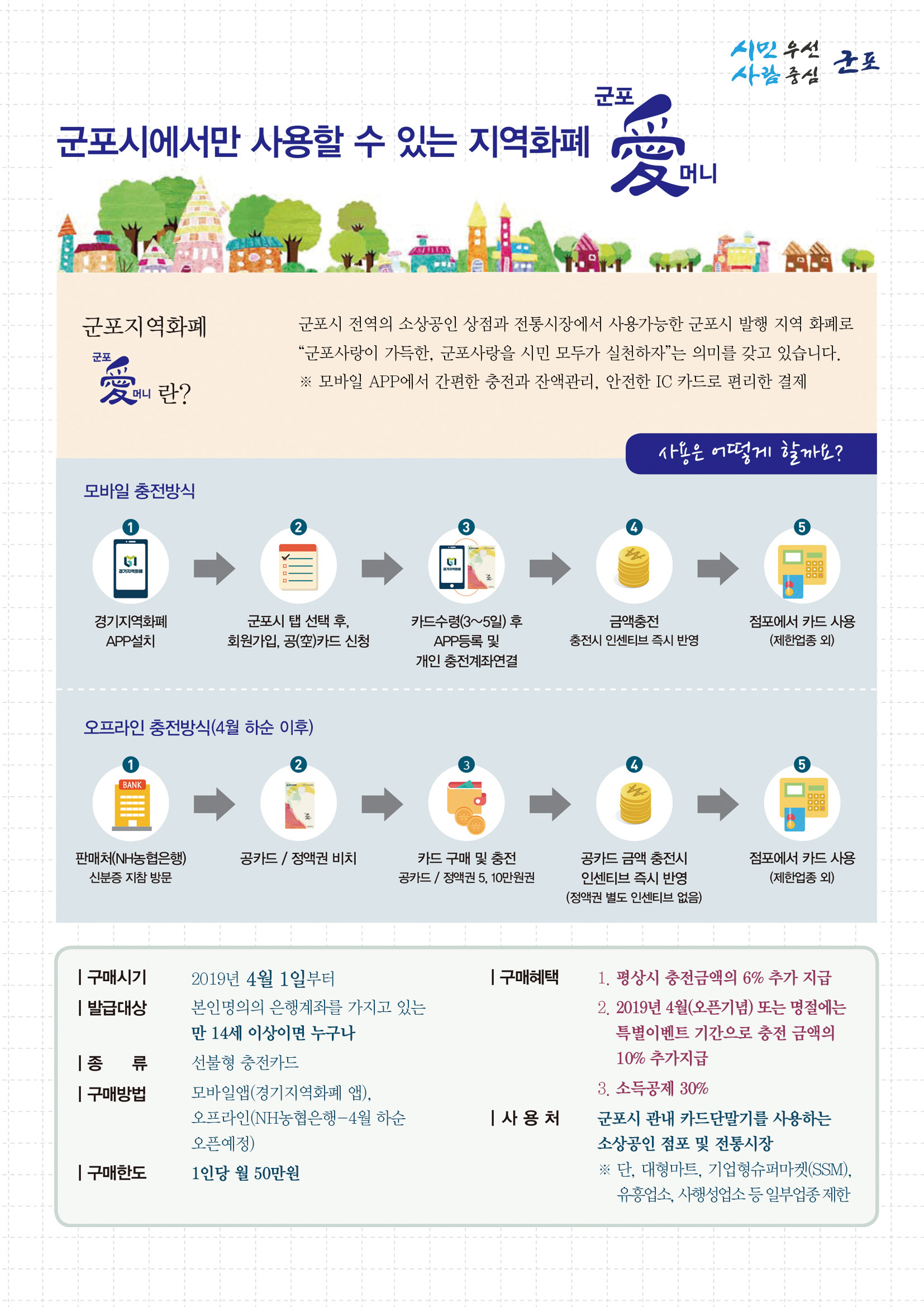 본사 군포지역화폐 『군포愛머니』 개시 알림 작성자 등록일자 2019년 4월 1일 10시 41분 47초 조회 913 군포 지역화폐 군포애머니(전단지).jpg [ Size : 621.16KB , Down : 216 ] 미리보기 다운로드 목록보기