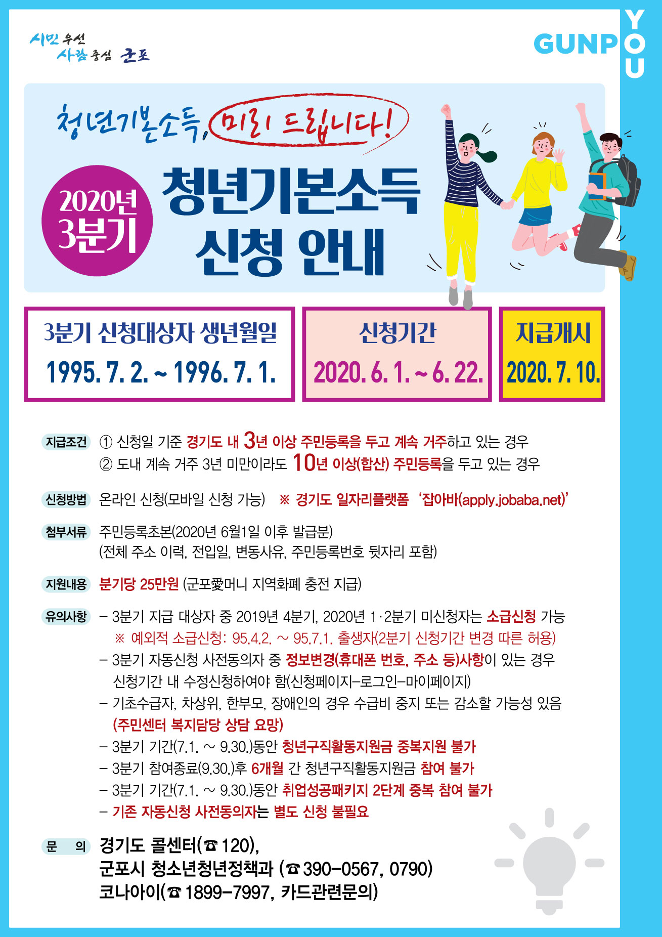 본사 2020년 3분기 청년기본소득 조기지급 안내 작성자 군포도시공사 등록일자 2020년 5월 27일 14시 7분 59초 조회 769 청년의 복지향상과 기본권 보장을 위한「2020년 3분기 청년기본소득」이 코로나19 확산으로 어려움을 겪고 있는 청년을 지원하고자 일정 변경하여 조기지급됩니다. 자세한 내용은 첨부파일을 참고하시기 바랍니다. 3분기청년기본소득(홍보물-최종본).jpg [ Size : 423.54KB , Down : 278 ] 미리보기 다운로드 목록보기