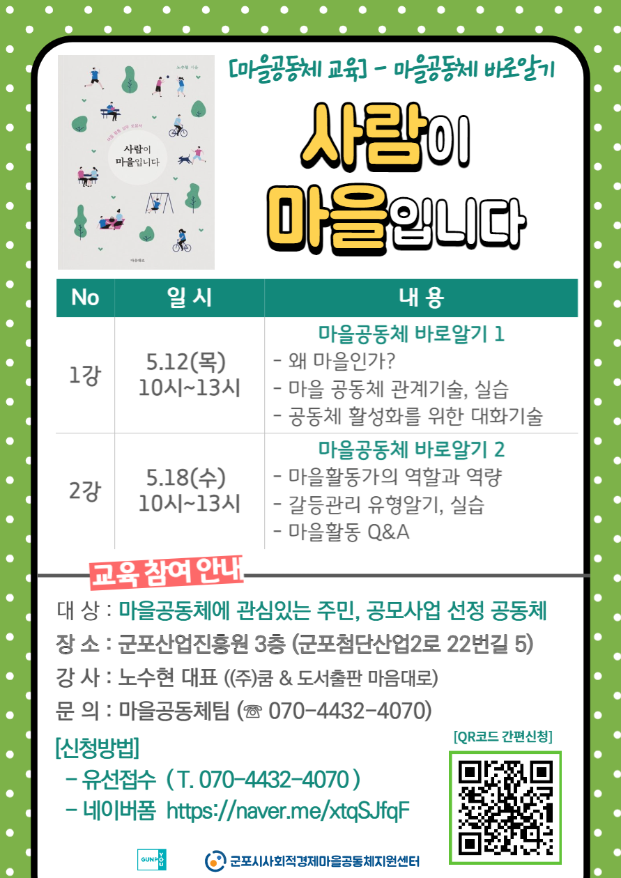 군포시 사회적경제 마을공동체지원센터에서 마을공동체에 대한 이해를 향상시키고, 타 공동체 사례를 통해 마을공동체 활동의 영역을 넓혀 공동체가 성장하고 지역사회를 변화시킬 수 있도록 마을공동체 교육을 진행하고자 하오니 많은 시민들의 참여 부탁드립니다.