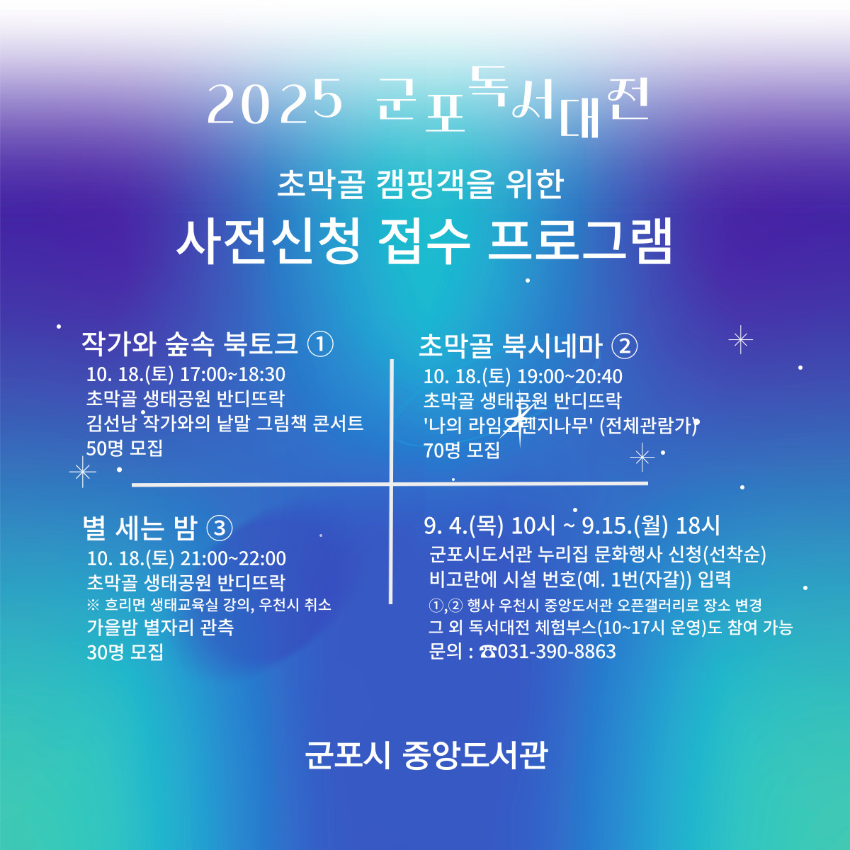 본사 2025년 군포독서대전 초막골 캠핑객을 위한 사전시청 접수 프로그램 작성자 군포도시공사 등록일자 2025년 8월 29일 13시 4분 6초 조회 275 사전접수홍보문(웹용).jpg [ Size : 334.62KB , Down : 298 ] 미리보기 다운로드 목록보기