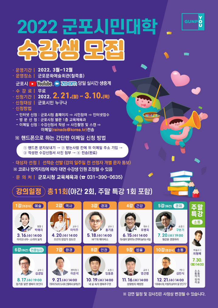 시민 누구나 참여하는 열린 교육으로 명사초청 강연을 통해 다양한 분야의 새로운 지식과 정보를 제공하고 성숙한 시민사회 구현을 위하여, 2022년「군포시민대학」을 운영하고자 하오니 많은 시민들이 참여부탁드립니다.