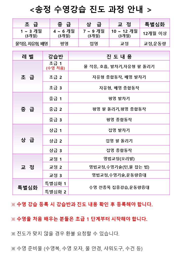 - 강습 신청 및 등록 후 반 변경 불가(예: 수영 중급반 신청 후 초급반 변경 불가)