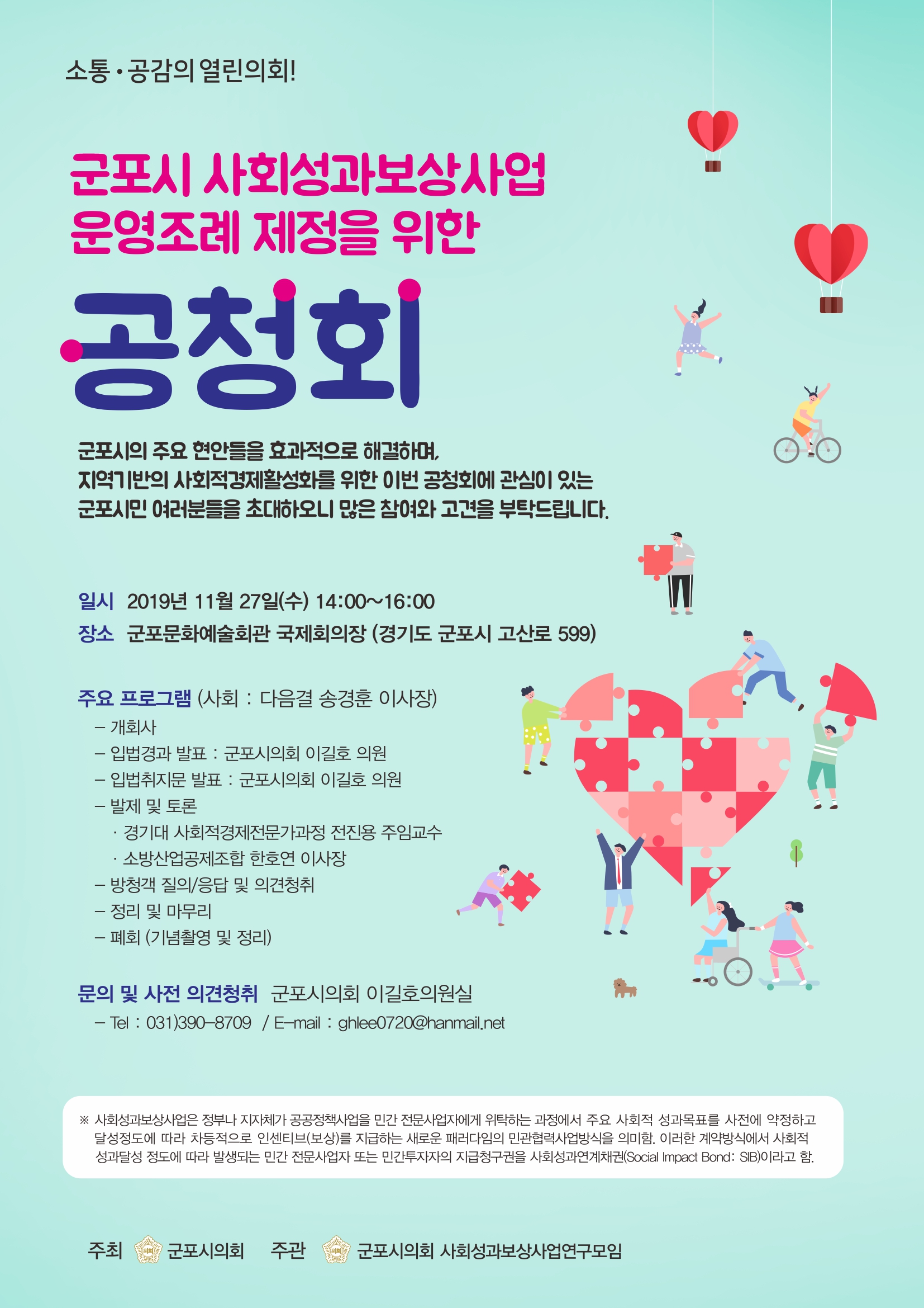 군포시의회 의원연구단체에서 아래와 같이 『군포시 사회성과보상사업 운영조례 제정을 위한 공청회』를 개최하오니, 군포시 실정에 맞는 사업을 발굴하고 주요 시정 현안사업에 도입할 수 있도록 시민 여러분의 많은 참석을 부탁 드립니다.