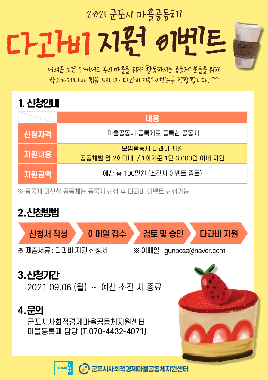 군포시 사회적경제-마을공동체 지원센터에서는 다양한 마을 공동체 주체발굴 및 마을공동체 활성화, 네트워크 구축을 위한 「마을공동체 등록제」사업 다과비 이벤트를 진행하고자 하오니 많은 시민들의 참여 부탁드립니다.