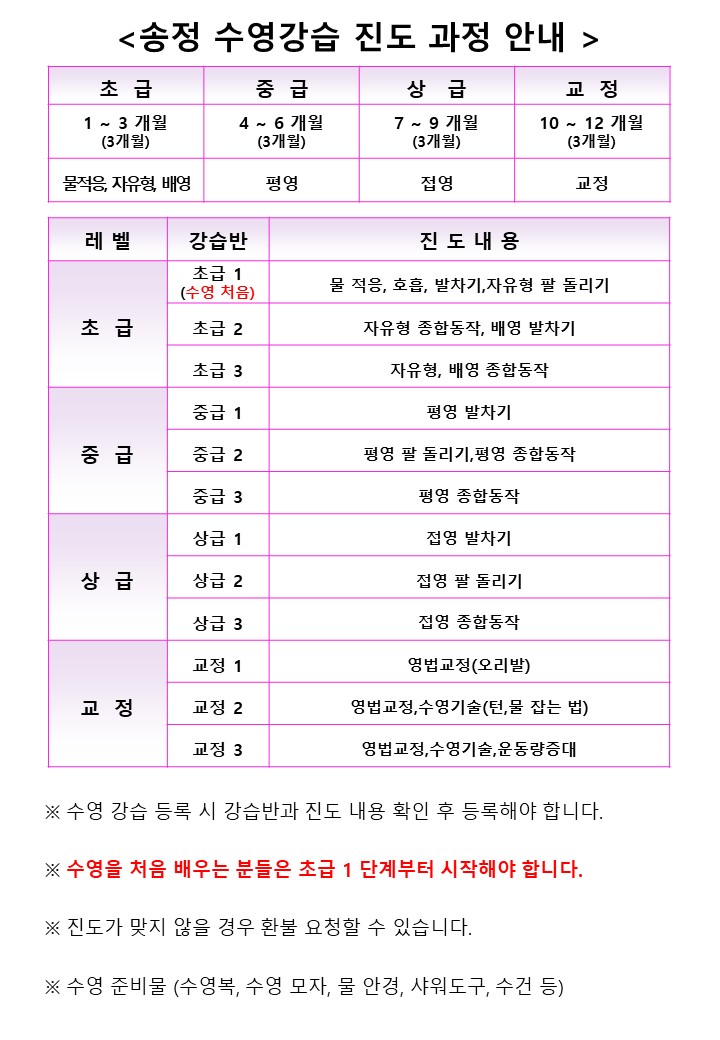 - 강습 신청 및 등록 후 반 변경 불가(예: 수영 중급반 신청 후 초급반 변경 불가)