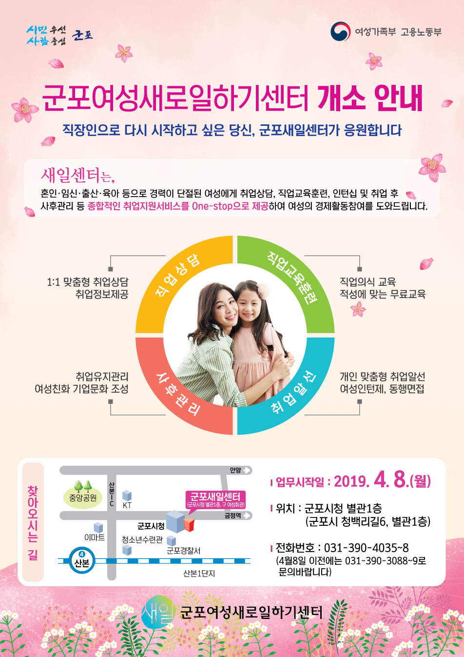 본사 군포여성새로일하기센터 개소 안내 작성자 등록일자 2019년 3월 21일 16시 27분 12초 조회 1,118 이미지가 작아 잘 안보이실 경우 첨부파일을 다운로드 받아 열어서 크게 보실 수 있으니 참고 바랍니다. 새일센터 개소 홍보문.jpg [ Size : 257.16KB , Down : 195 ] 미리보기 다운로드 목록보기