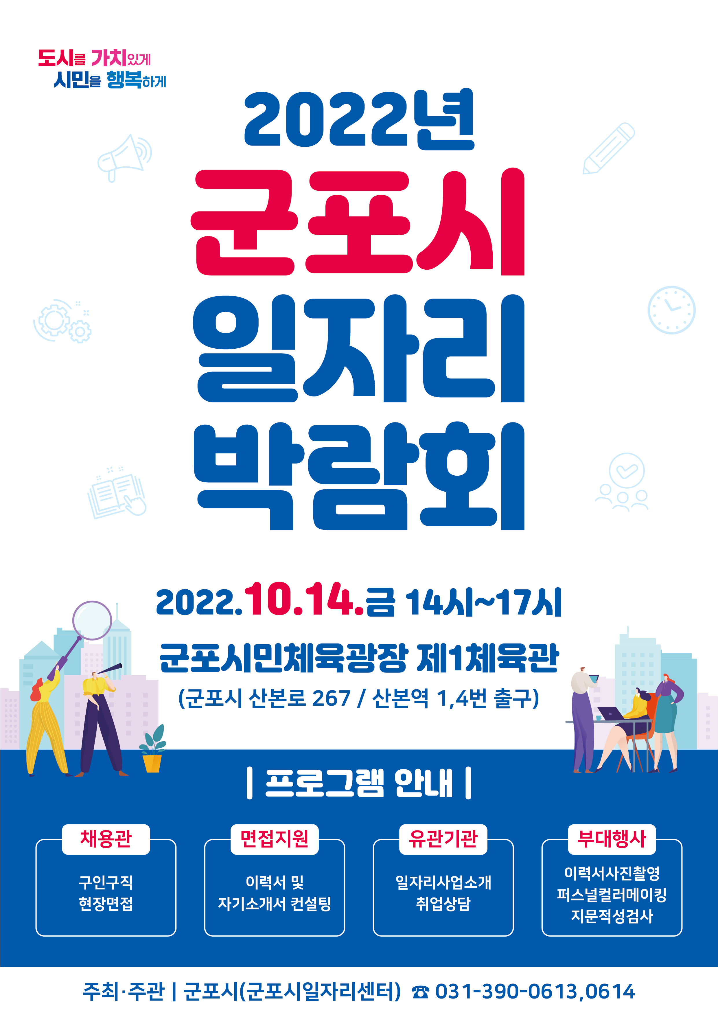 우수 인력을 필요로 하는 기업체와 취업을 희망하는 구직자에게 만남의 장을 제공하는『2022년 군포시 일자리 박람회』를 아래와 같이 개최하오니 많은 참여 부탁드립니다.