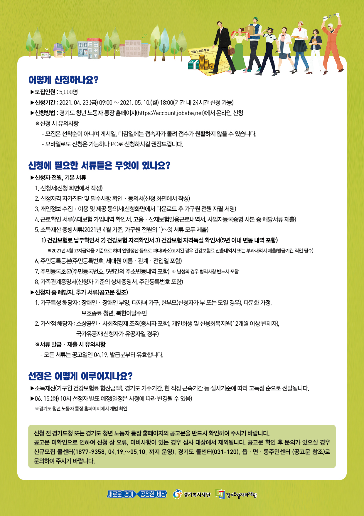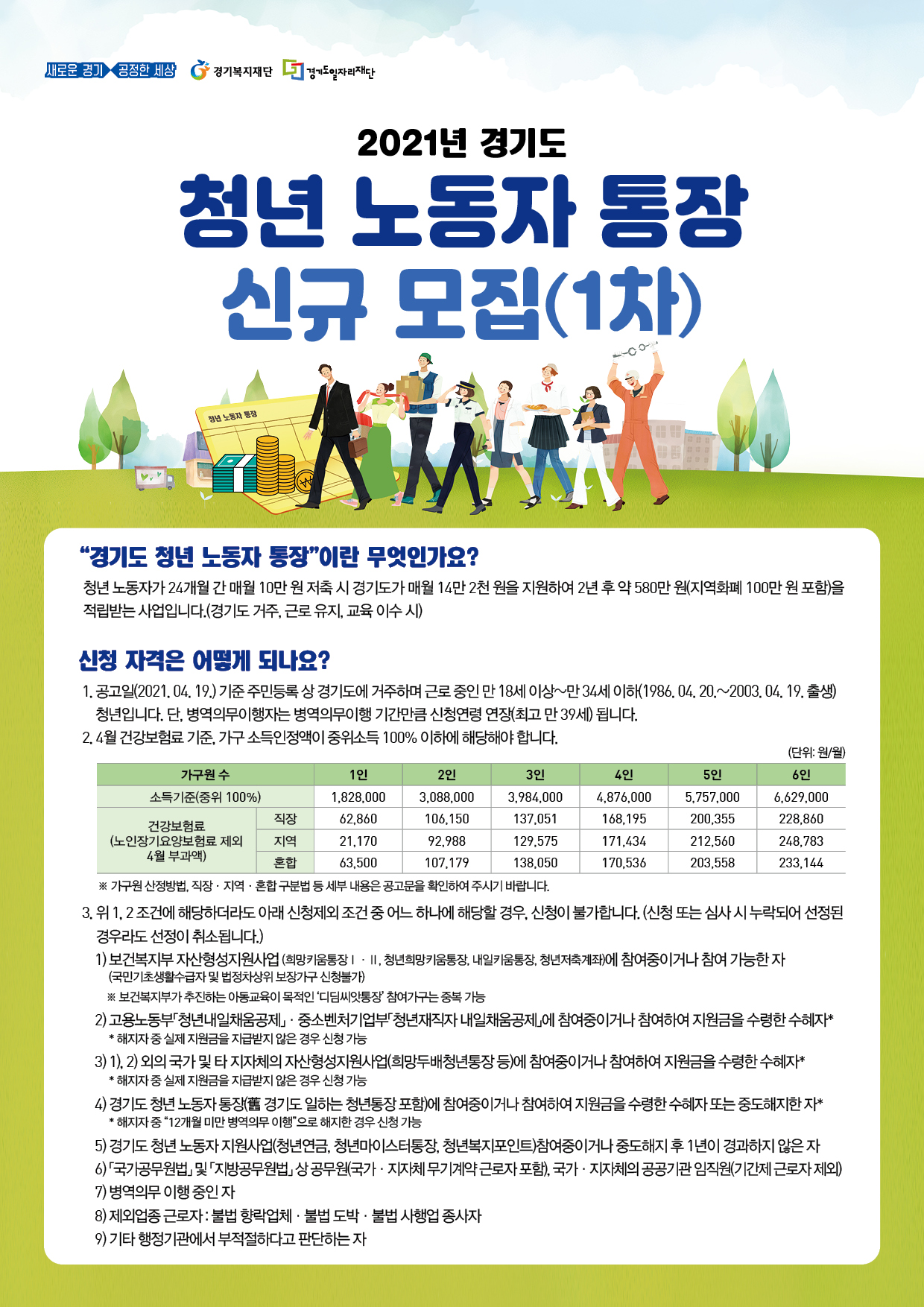 본사 2021년 경기도 청년 노동자 통장 참여자 모집 홍보 작성자 CS담당자 등록일자 2021년 4월 19일 14시 10분 37초 조회 506 2021년 경기도 청년 노동자 통장에 참여할 신규 대상자를 모집합니다. (군포시: 115명 예정)자세한 사항은 첨부파일 확인바랍니다.문의: 군포시 청소년청년정책과 031-390-0567 청년 노동자 통장 (포스터).jpg [ Size : 484.88KB , Down : 154 ] 미리보기 다운로드 청년 노동자 통장(전단)-앞면.jpg [ Size : 1018.14KB , Down : 144 ] 미리보기 다운로드 청년 노동자 통장(전단)-뒷면.jpg [ Size : 945.94KB , Down : 136 ] 미리보기 다운로드 목록보기
