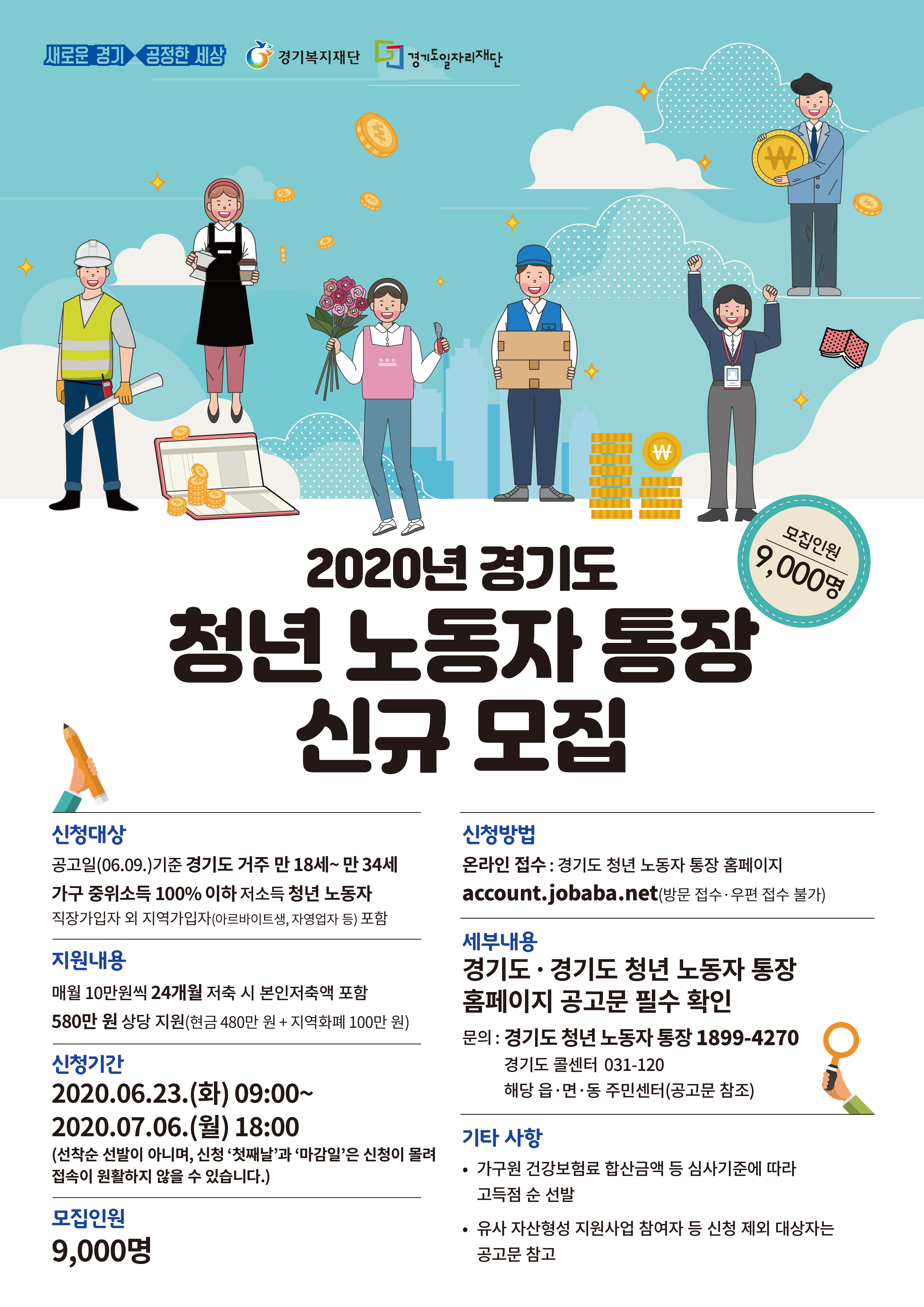 도내 저소득 청년노동자들의 노동의지 고취 및 금융역량 강화를 위해 ‘2020년 경기도 청년 노동자 통장’ 지원 대상자를 모집하오니, 신청 자격이 있는 관내 청년께서는 신청하시기 바랍니다.