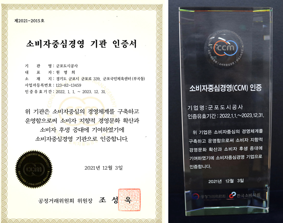군포도시공사(사장 원명희)는 공정거래위원회로부터 소비자중심경영(CCM·Consumer Centered Management) 재인증을 획득했다고 밝혔다.