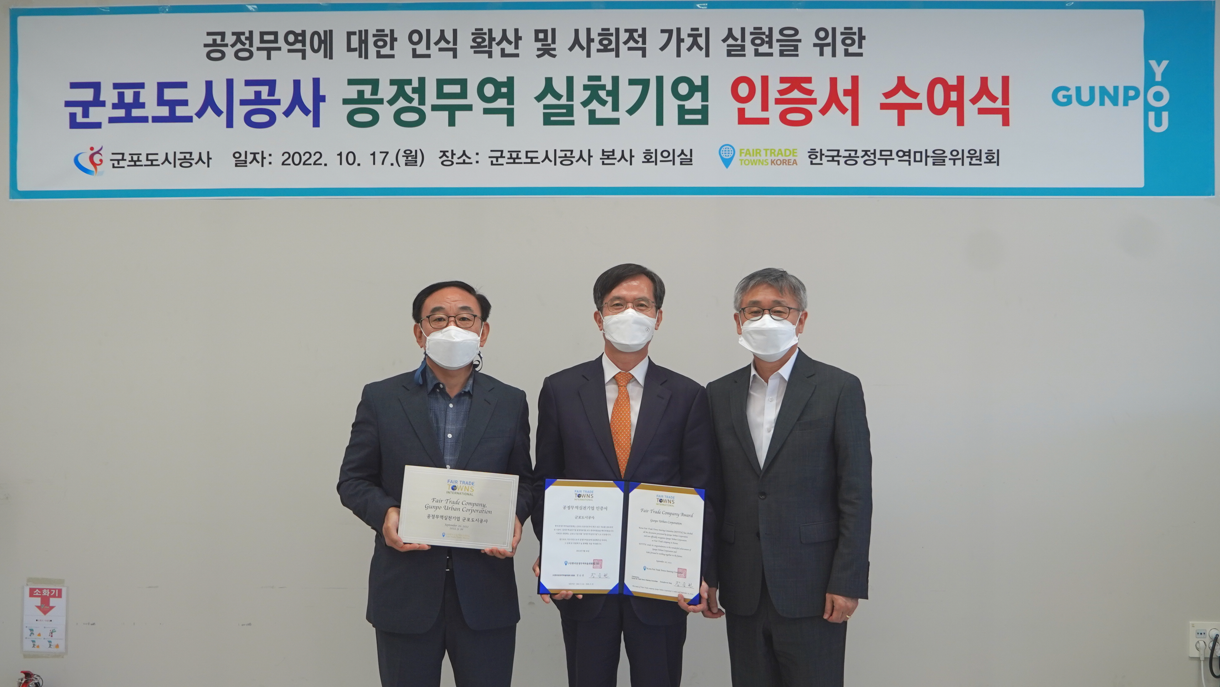 □ 군포도시공사(사장 원명희)는 지난 17일 본사에서 (사)한국공정무역 마을위원회(위원장 장승권)이 참석한 가운데 ‘공정무역 실천기업’ 인증서 수여식을 개최했다고 밝혔다.