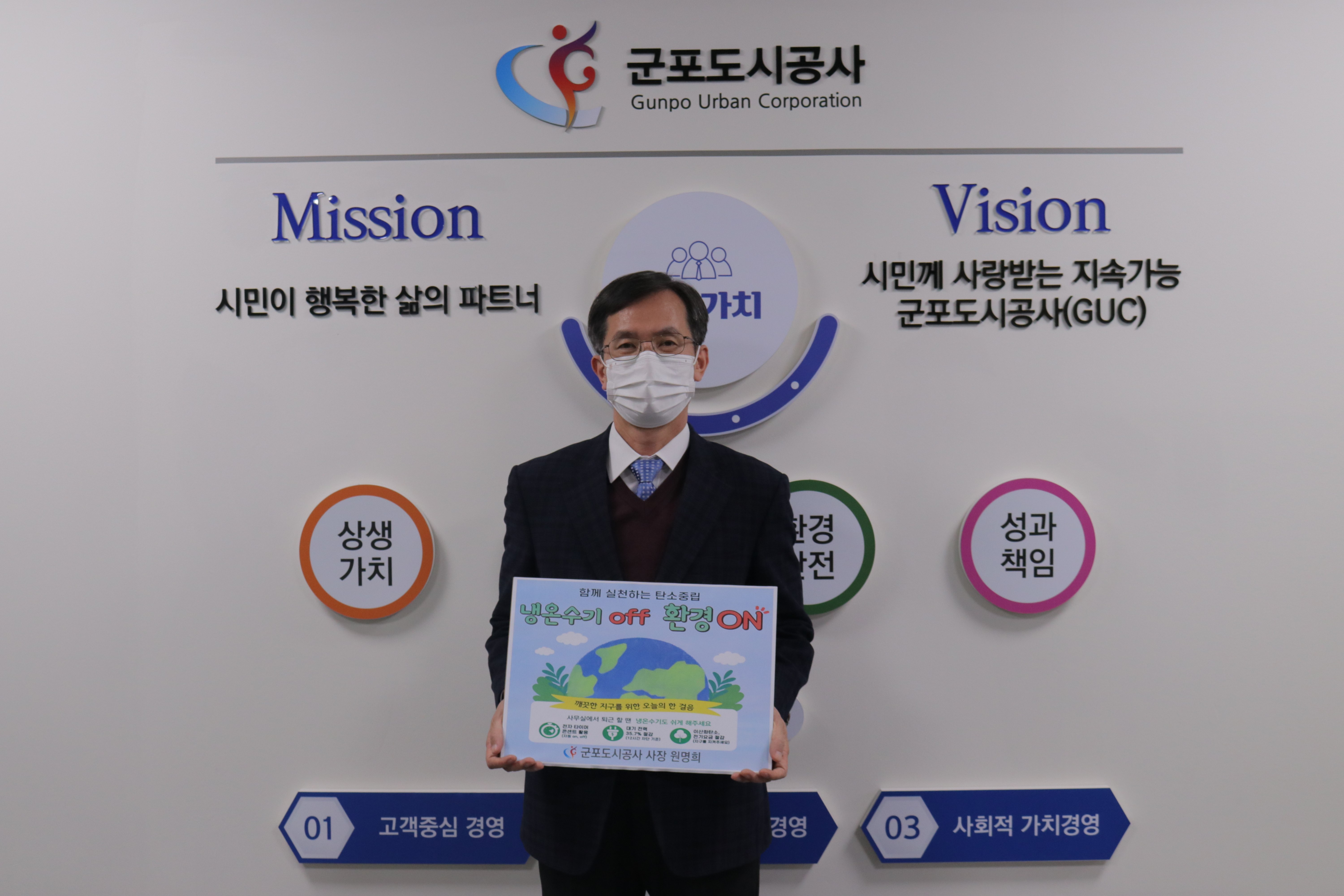 군포도시공사 원명희 사장은 용인도시공사 최찬용 사장의 지목을 받아 ‘함께 실천하는 탄소중립, 냉온수기 OFF 환경 ON’이라는 문구가 적힌 팻말을 들고 사진 촬영을 한뒤 군포도시공사 SNS인 페이스북 (https://www.facebook.com/gunpouc)에 게시하는 방식으로 진행됐다.