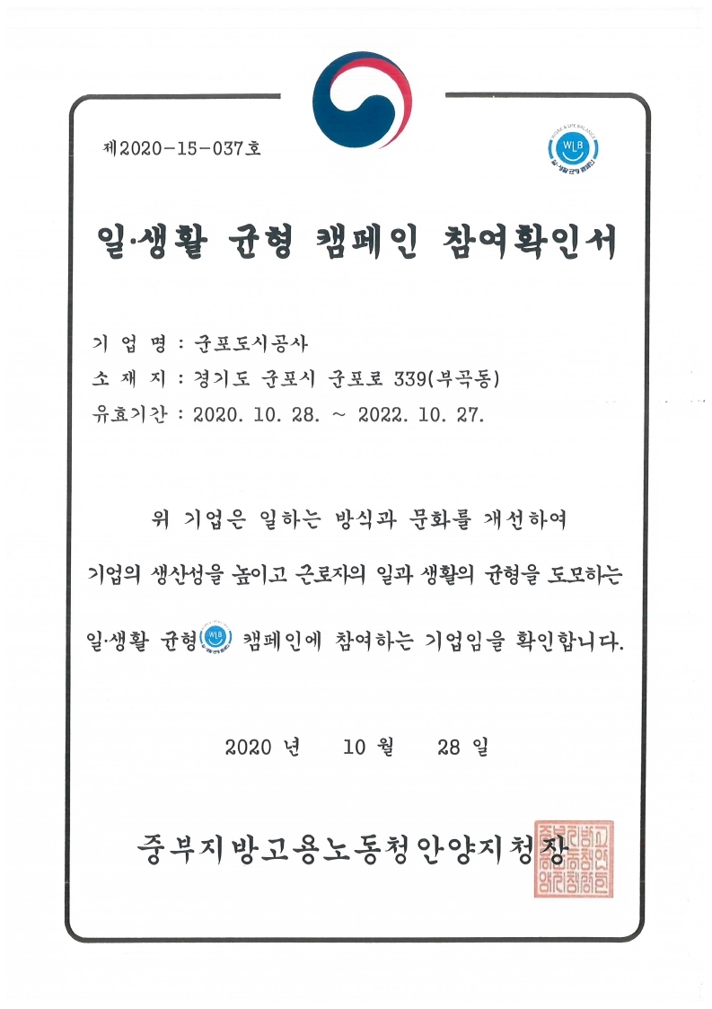 군포도시공사(원명희 사장)는 지난 28일 고용노동부에서 주관하는 일·생활 균형 캠페인에 참여했다고 말했다.