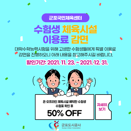 군포도시공사(사장 원명희)는 오는 11월 23일부터 12월 31일까지 대학수학능력시험을 치른 군포시 수험생들에게 군포국민체육센터 내 체육시설을 50% 감면된 금액으로 이용할 수 있도록 ‘수험생 특별 할인 혜택’을 제공한다고 밝혔다.