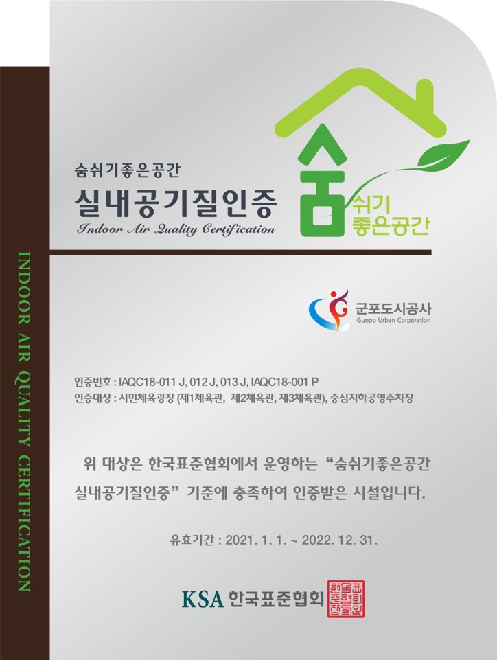 군포도시공사(원명희 사장)가 운영하는 시민체육광장 제1,2,3체육관과 중심지하공영주차장이 2회 연속으로 한국표준협회(KSA) ‘실내공기질 인증’을 획득해 ‘숨쉬기 좋은 공간’으로 선정됐다고 28일 밝혔다.