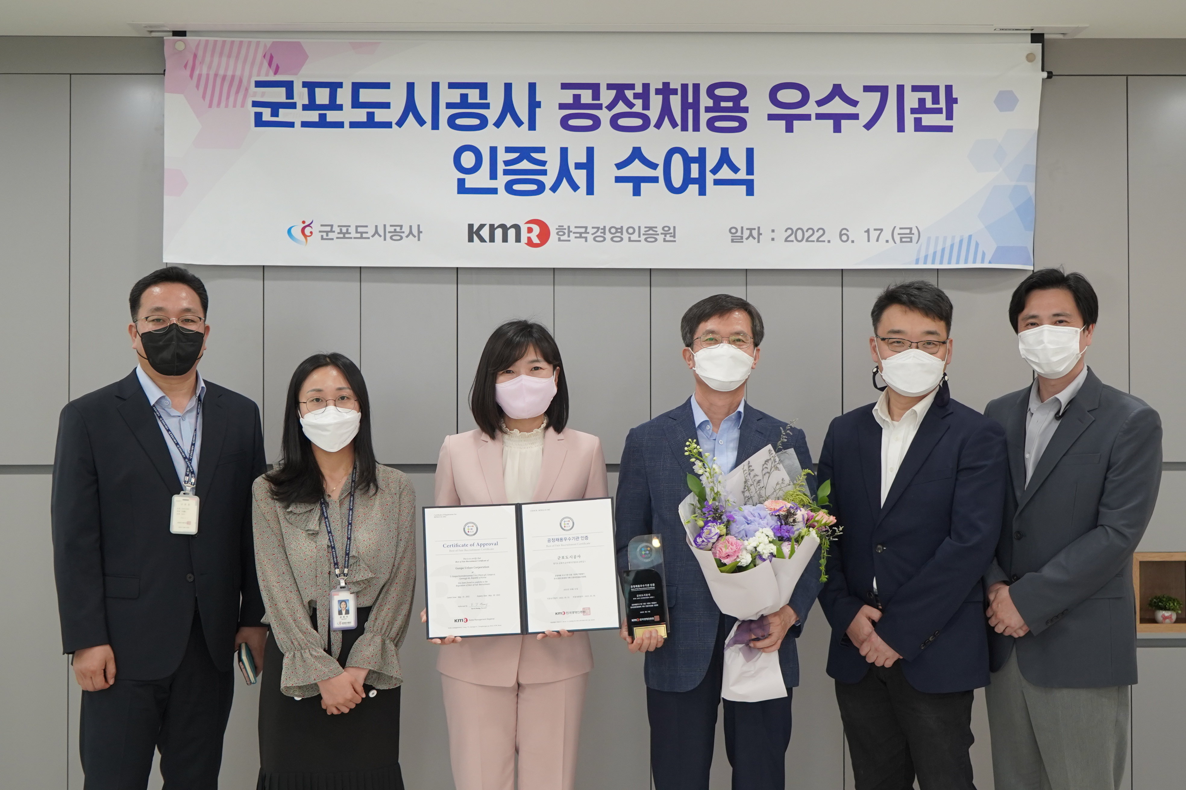 군포도시공사(사장 원명희)는 6월 17일 한국경영인증원(원장 황은주)이 주관하는 2022년 상반기 공정채용 우수기관 인증을 획득했다고 밝혔다.