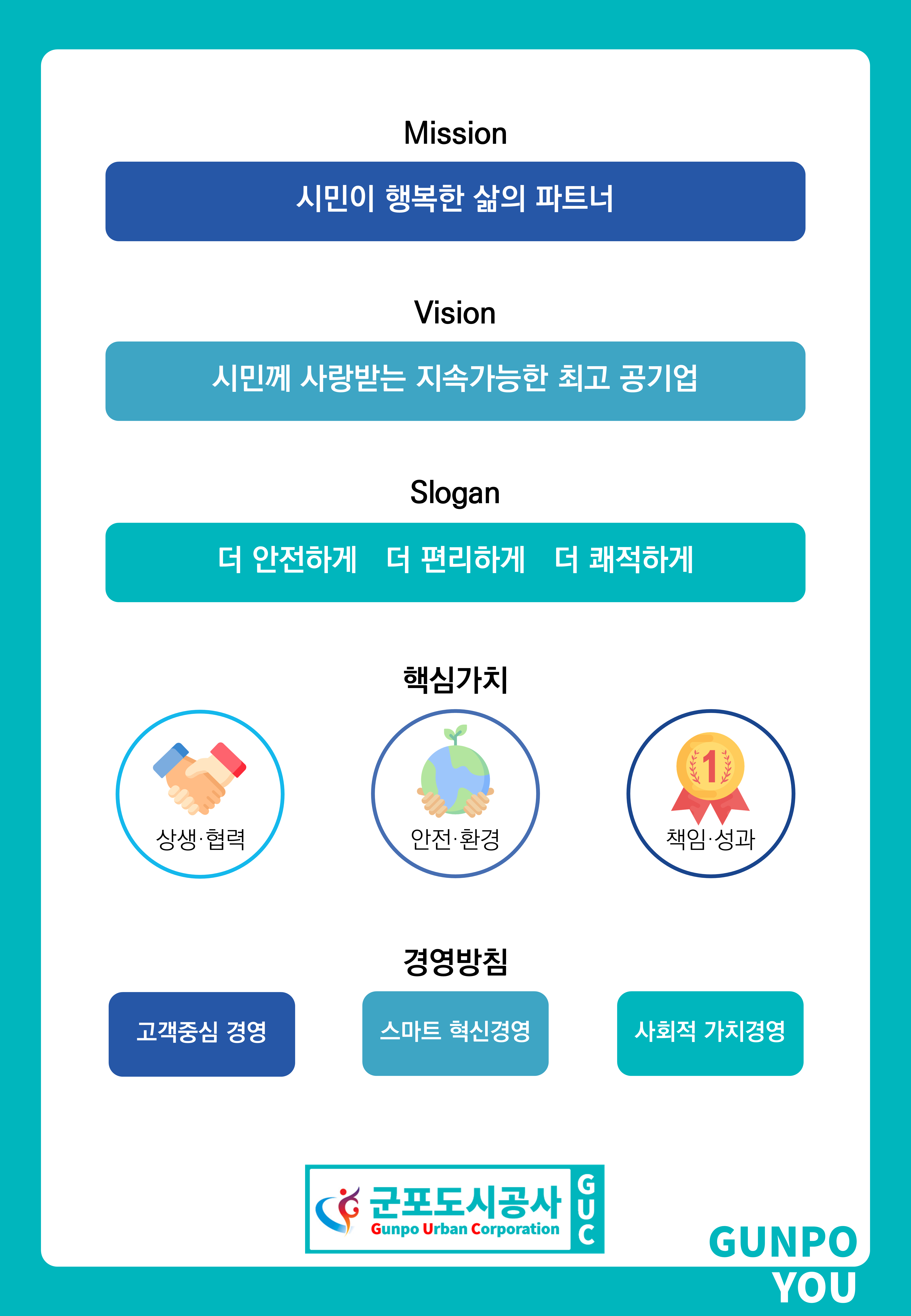 군포도시공사(사장 원명희)는 임직원이 공사의 미션인 ‘시민이 행복한 삶의 파트너’를 확고히 실현하도록 경영전략체계를 개선했다고 밝혔다.