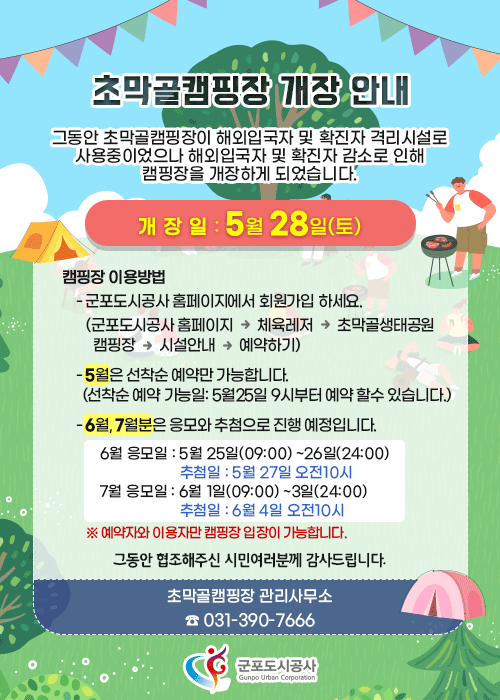 초막골캠핑장이 해외입국자 및 확진자 격리시설로 사용중이었으나 해외입국자 및 확진자 감소로 인해 개장하게 되었습니다.