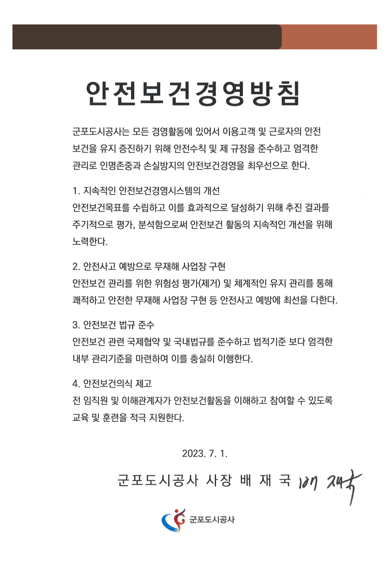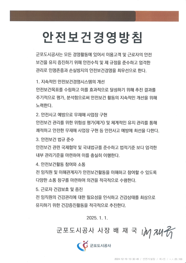 군포도시공사는 모든 경영활동에 있어서 이용고객 및 근로자의 안전 보건을 유지 증진하기 위해 안전수칙 및 제 규정을 준수하고 엄격한 관리로 인명존중과 손실방지의 안전보건경영을 최우선으로 한다.